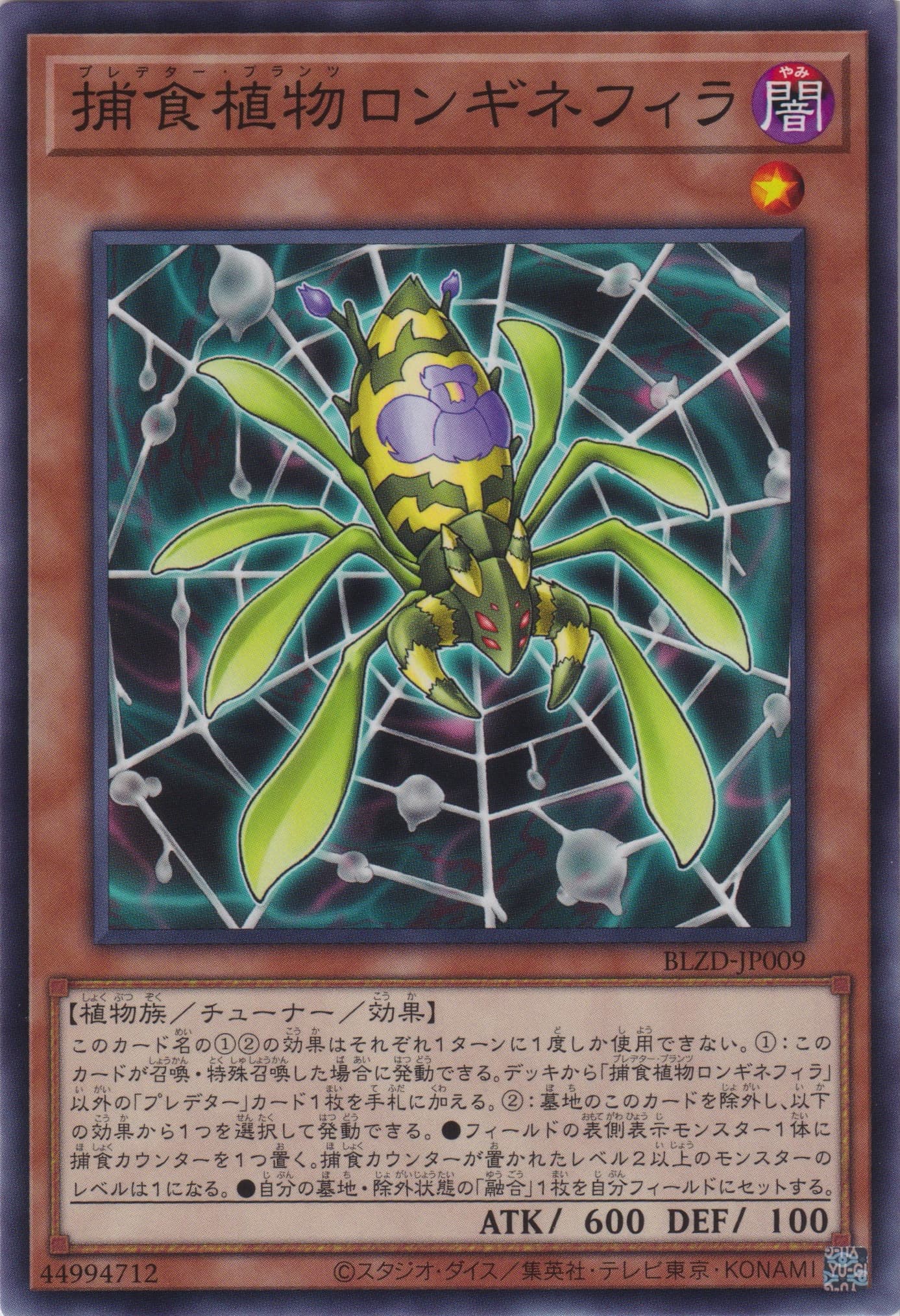 このカード名の①②の効果はそれぞれ1ターンに1度しか使用できない。 ①:このカードが召喚・特殊召喚した場合に発動できる。デッキから「捕食植物ロンギネフィラ」以外の「プレデター」カード1枚を手札に加える。 ②:墓地のこのカードを除外し、以下の効果から1つを選択して発動できる。 ●フィールドの表側表示モンスター1体に捕食カウンターを1つ置く。捕食カウンターが置かれたレベル2以上のモンスターのレベルは1になる。 ●自分の墓地・除外状態の「融合」1枚を自分フィールドにセットする。