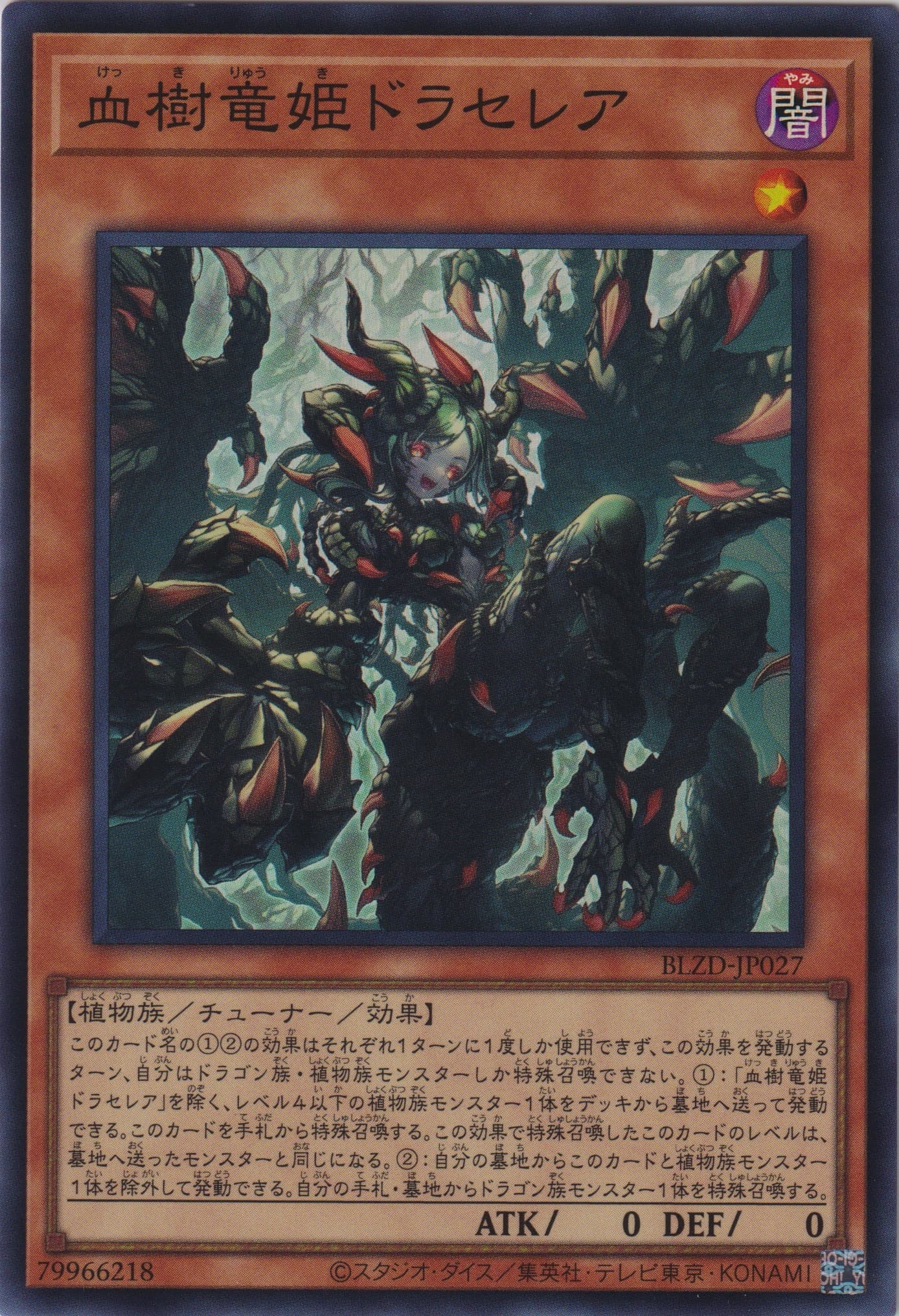 このカード名の①②の効果はそれぞれ1ターンに1度しか使用できず、この効果を発動するターン、自分はドラゴン族植物族モンスターしか特殊召喚できない。 ①:「血樹竜姫ドラセレア」を除く、レベル4以下の植物族モンスター1体をデッキから墓地へ送って発動できる。このカードを手札から特殊召喚する。この効果で特殊召喚したこのカードのレベルは、墓地へ送ったモンスターと同じになる。 ②:自分の墓地からこのカードと植物族モンスター1体を除外して発動できる。自分の手札・墓地からドラゴン族モンスター1体を特殊召喚する。