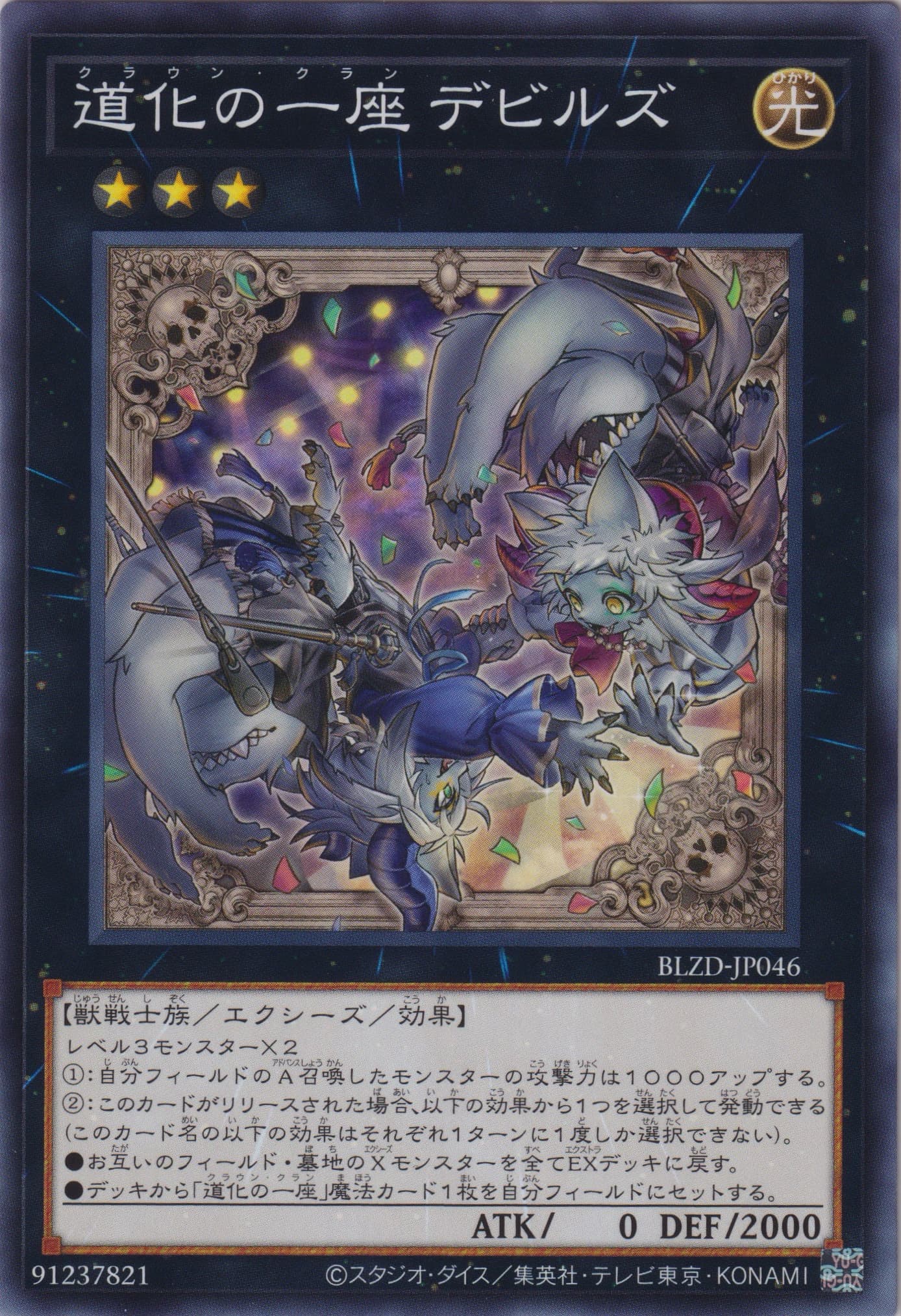 「道化の一座」カードにより降臨 このカード名の①の効果は1ターンに1度しか使用できない。 ①:手札のこのカードを相手に見せて発動できる。デッキから儀式モンスター以外の「道化の一座」カード1枚を手札に加える。その後、自分の手札を1枚選んで捨てる。 ②:このカードがリリースされた場合、以下の効果から1つを選択して発動できる(このカード名の以下の効果はそれぞれ1ターンに1度しか選択できない)。 ●お互いのフィールド・墓地の儀式モンスターを全てデッキに戻す。 ●フィールドの効果モンスター1体を裏側守備表示にする。