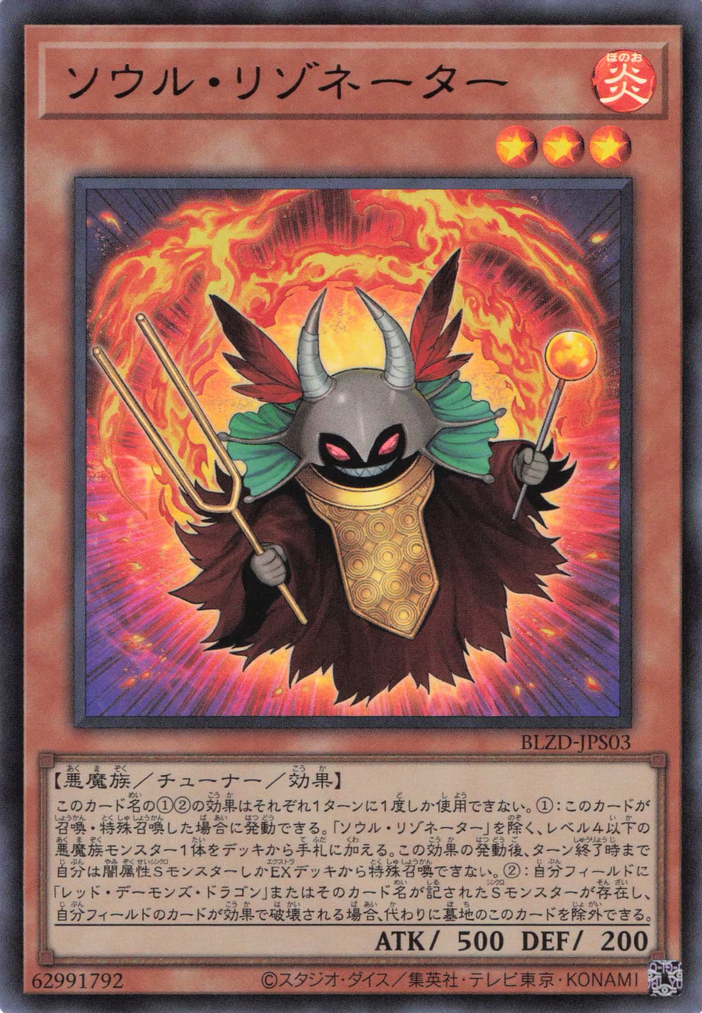 このカード名の①②の効果はそれぞれ1ターンに1度しか使用できない。 ①:このカードが召喚・特殊召喚した場合に発動できる。「ソウル・リゾネーター」を除く、レベル4以下の悪魔族モンスター1体をデッキから手札に加える。この効果の発動後、ターン終了時まで自分は闇属性SモンスターしかEXデッキから特殊召喚できない。 ②:自分フィールドに「レッド・デーモンズ・ドラゴン」またはそのカード名が記されたSモンスターが存在し、自分フィールドのカードが効果で破壊される場合、代わりに墓地のこのカードを除外できる。
