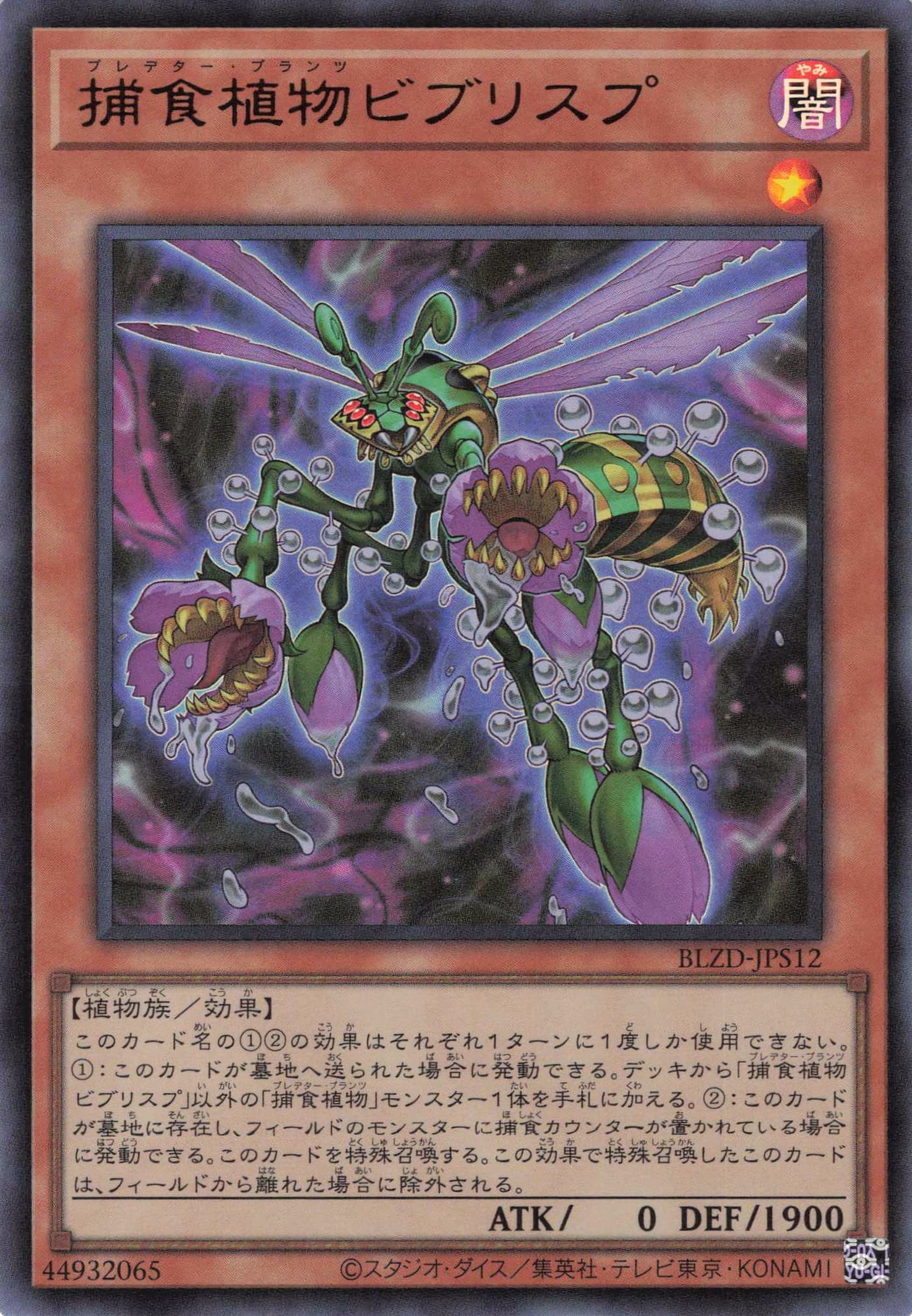 このカード名の①②の効果はそれぞれ1ターンに1度しか使用できない。 ①:このカードが墓地へ送られた場合に発動できる。デッキから「捕食植物ビブリスプ」以外の「捕食植物」モンスター1体を手札に加える。 ②:このカードが墓地に存在し、フィールドのモンスターに捕食カウンターが置かれている場合に発動できる。このカードを特殊召喚する。この効果で特殊召喚したこのカードは、フィールドから離れた場合に除外される。