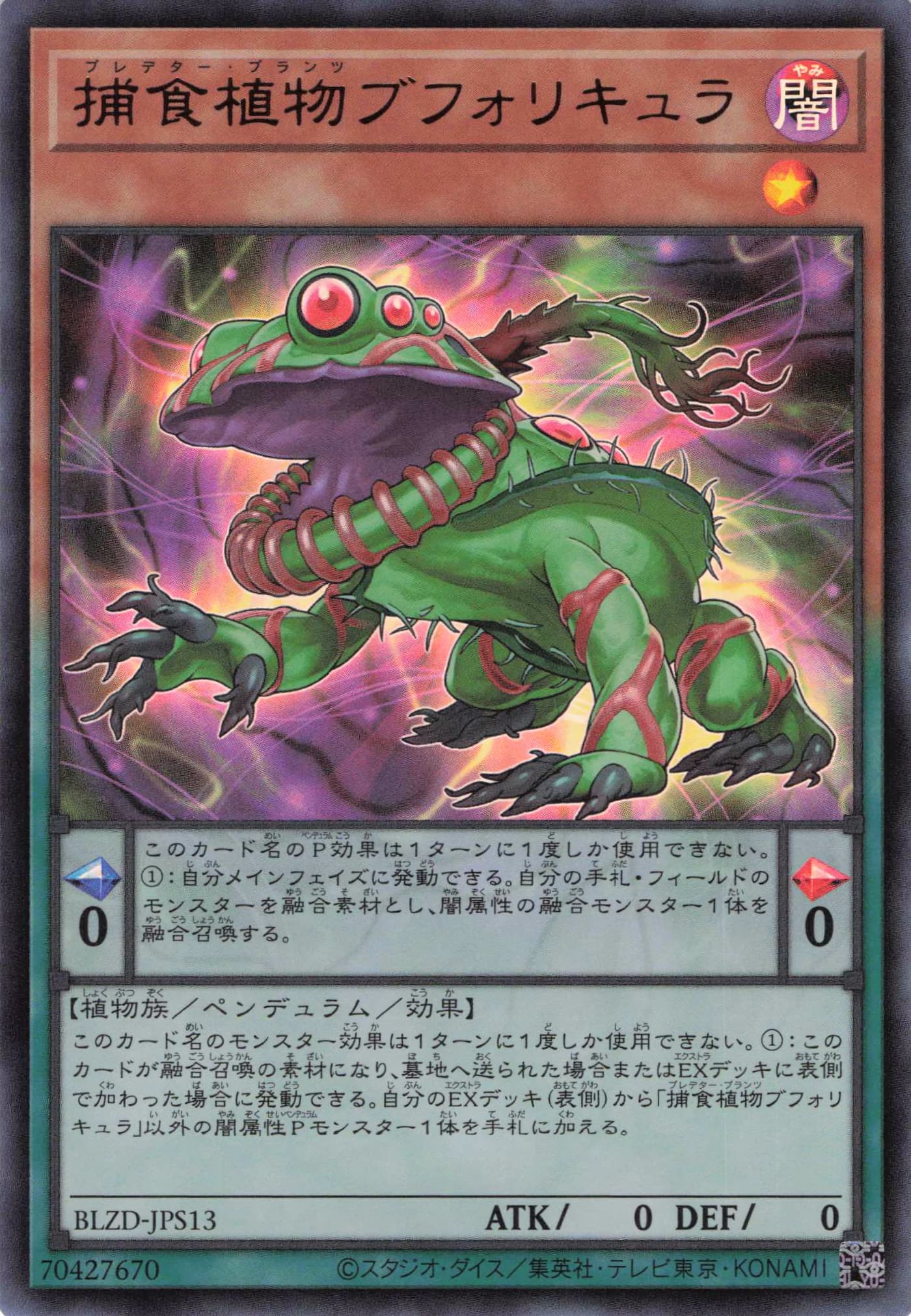 このカード名のモンスター効果は1ターンに1度しか使用できない。 ①:このカードが融合召喚の素材になり、墓地へ送られた場合またはEXデッキに表側で加わった場合に発動できる。自分のEXデッキ(表側)から「捕食植物ブフォリキュラ」以外の闇属性Pモンスター1体を手札に加える。