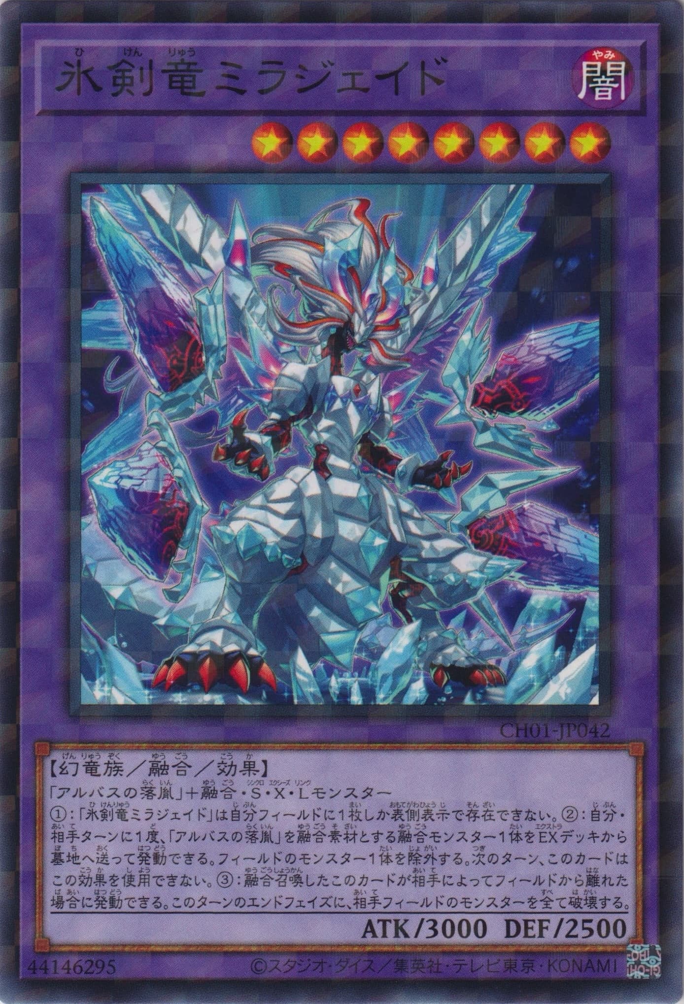 | 「アルバスの落胤」+融合・S・X・Lモンスター ①:「氷剣竜ミラジェイド」は自分フィールドに1枚しか表側表示で存在できない。 ②:自分・相手ターンに1度、「アルバスの落胤」を融合素材とする融合モンスター1体をEXデッキから墓地へ送って発動できる。フィールドのモンスター1体を除外する。次のターン、このカードはこの効果を使用できない。 ③:融合召喚したこのカードが相手によってフィールドから離れた場合に発動できる。このターンのエンドフェイズに、相手フィールドのモンスターを全て破壊する。 | ||||||||