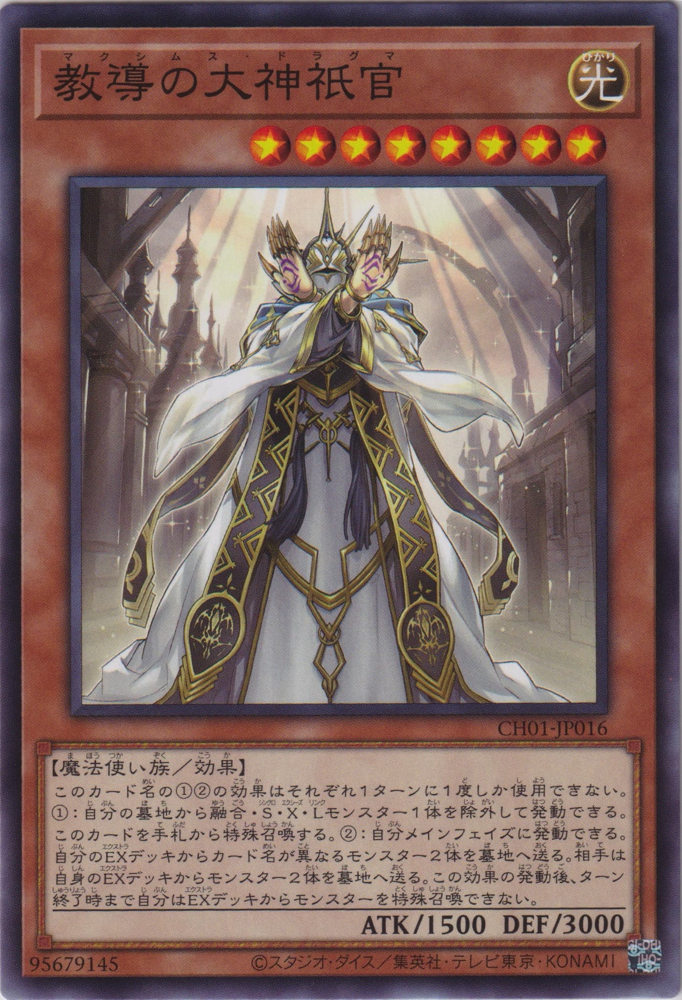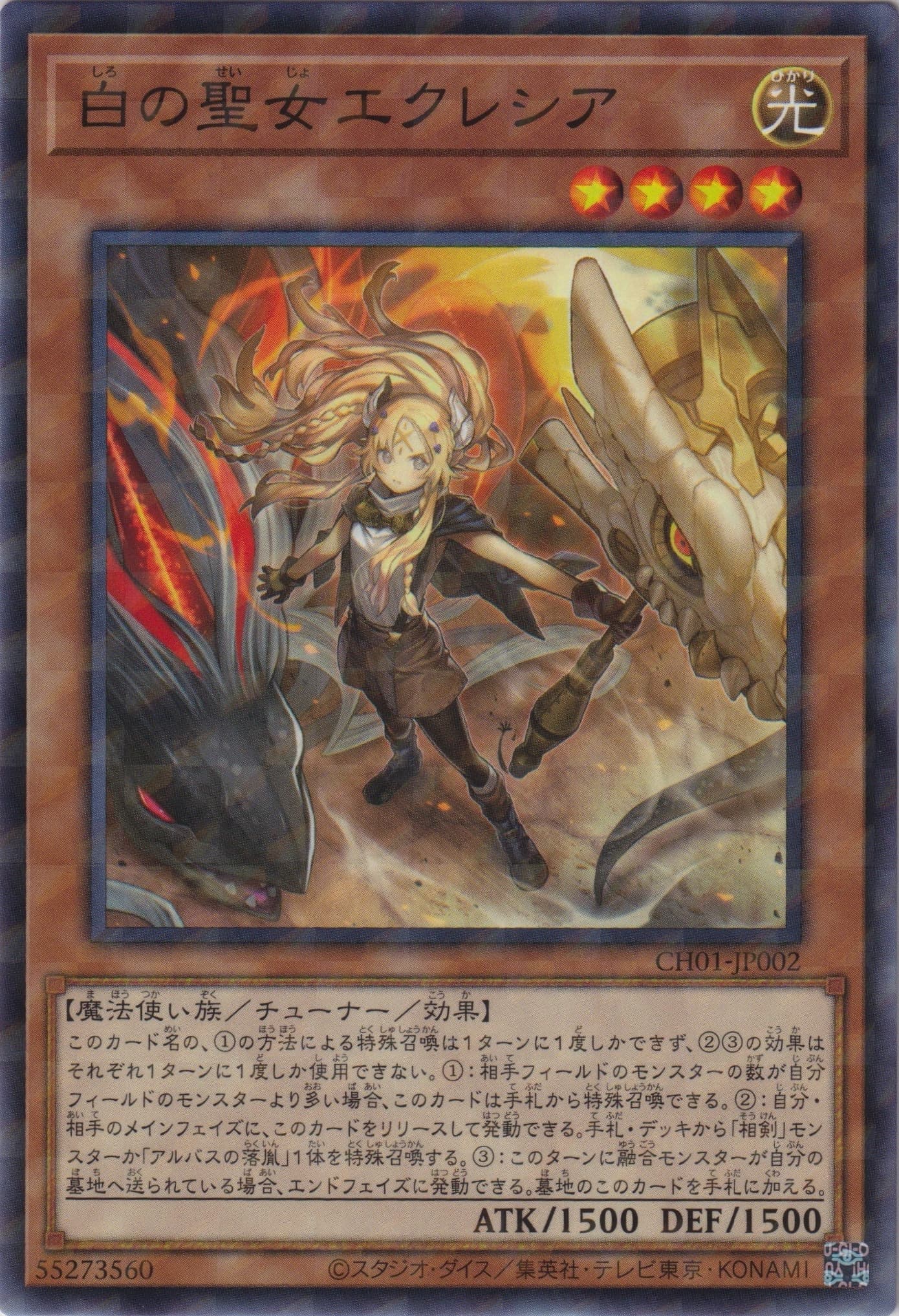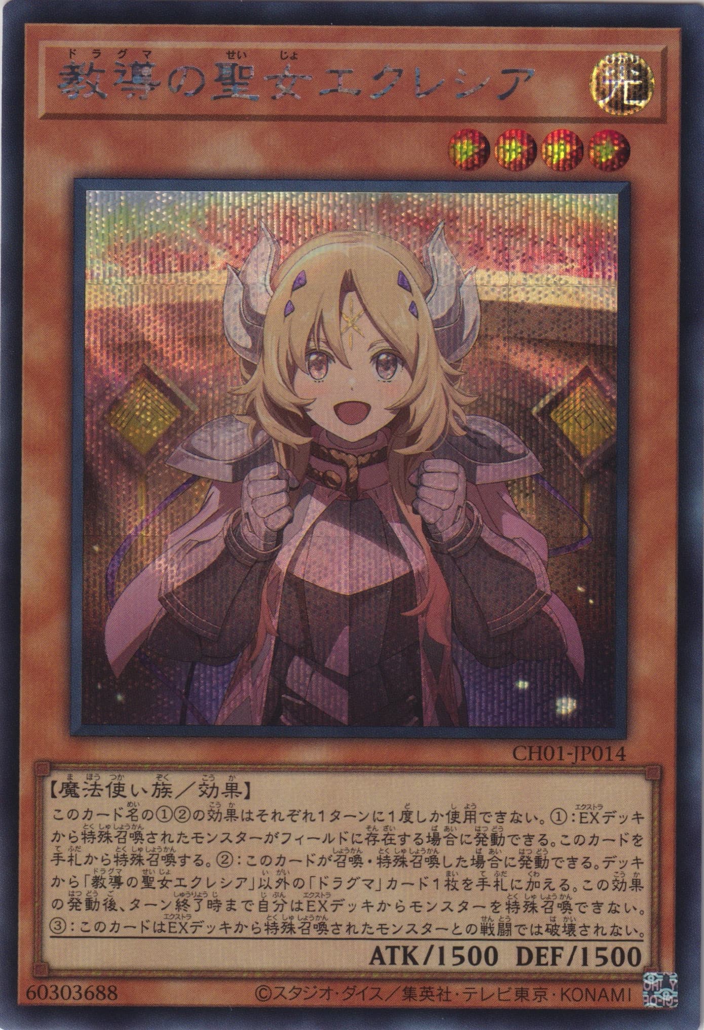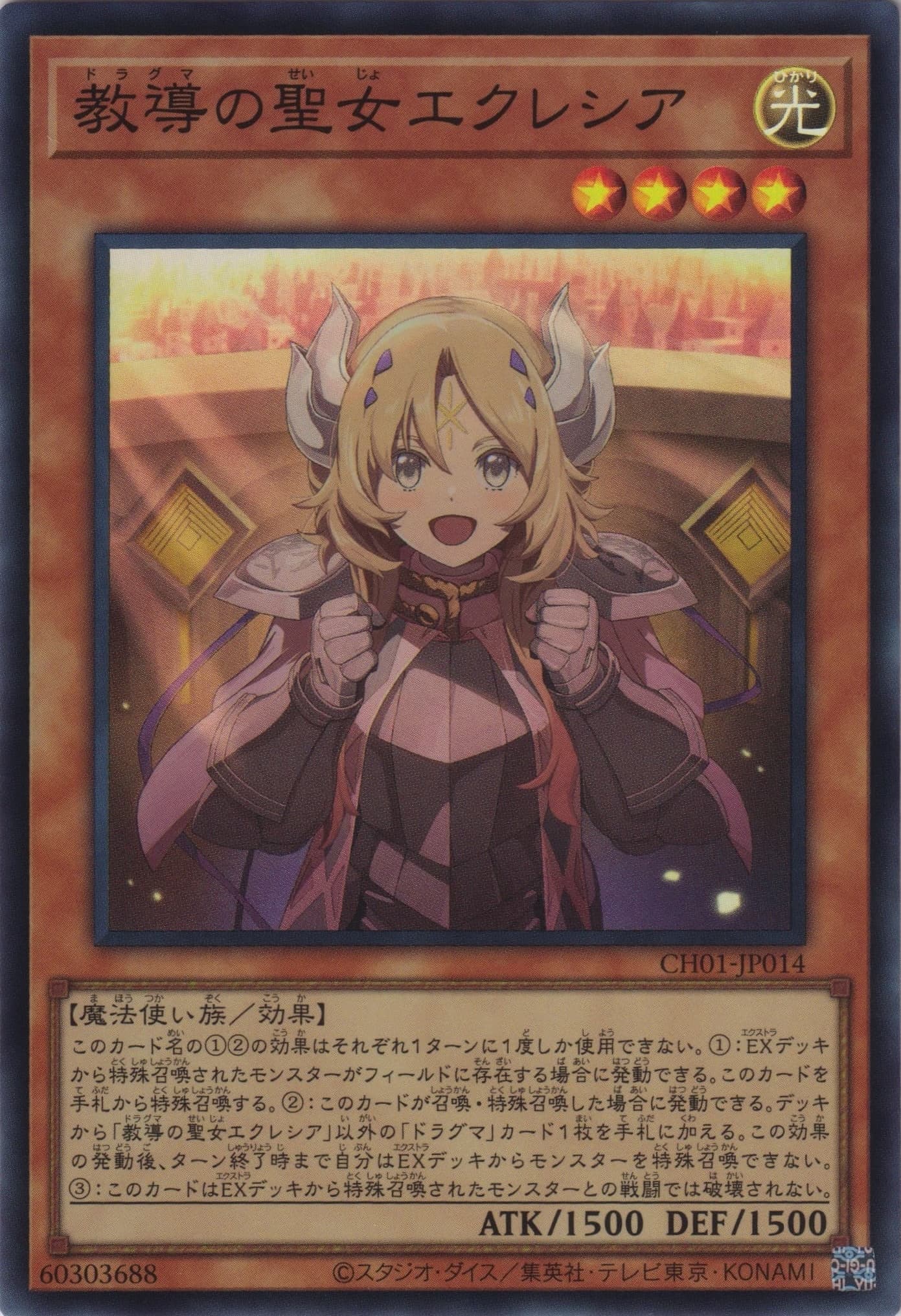 このカード名の①②の効果はそれぞれ1ターンに1度しか使用できない。 ①:EXデッキから特殊召喚されたモンスターがフィールドに存在する場合に発動できる。このカードを手札から特殊召喚する。 ②:このカードが召喚・特殊召喚した場合に発動できる。デッキから「教導の聖女エクレシア」以外の「ドラグマ」カード1枚を手札に加える。この効果の発動後、ターン終了時まで自分はEXデッキからモンスターを特殊召喚できない。 ③:このカードはEXデッキから特殊召喚されたモンスターとの戦闘では破壊されない。