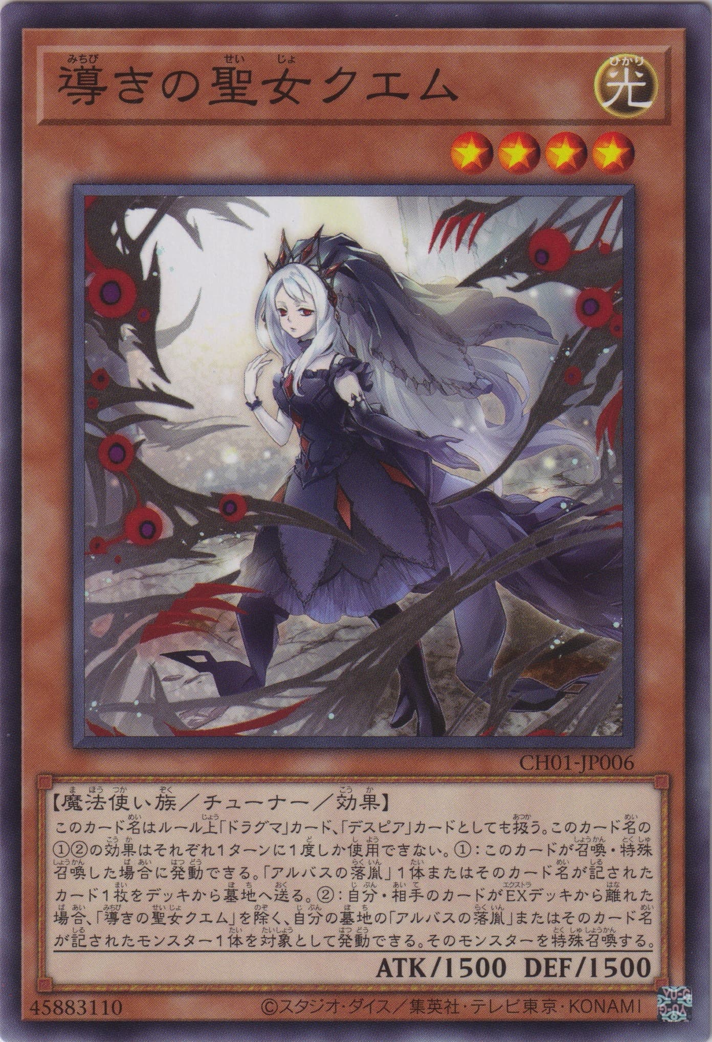 このカード名はルール上「ドラグマ」カード、「デスピア」カードとしても扱う。 このカード名の①②の効果はそれぞれ1ターンに1度しか使用できない。 ①:このカードが召喚・特殊召喚した場合に発動できる。「アルバスの落胤」1体またはそのカード名が記されたカード1枚をデッキから墓地へ送る。 ②:自分・相手のカードがEXデッキから離れた場合、「導きの聖女クエム」を除く、自分の墓地の「アルバスの落胤」またはそのカード名が記されたモンスター1体を対象として発動できる。そのモンスターを特殊召喚する。