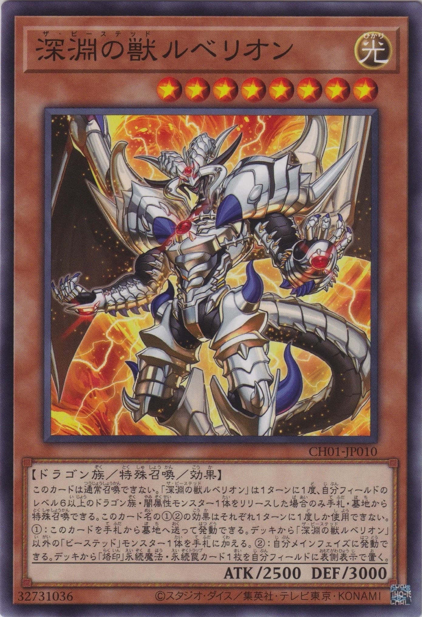 このカードは通常召喚できない。 「深淵の獣ルベリオン」は1ターンに1度、自分フィールドのレベル6以上のドラゴン族・闇属性モンスター1体をリリースした場合のみ手札・墓地から特殊召喚できる。 このカード名の①②の効果はそれぞれ1ターンに1度しか使用できない。 ①:このカードを手札から墓地へ送って発動できる。デッキから「深淵の獣ルベリオン」以外の「ビーステッド」モンスター1体を手札に加える。 ②:自分メインフェイズに発動できる。デッキから「烙印」永続魔法・永続罠カード1枚を自分フィールドに表側表示で置く。