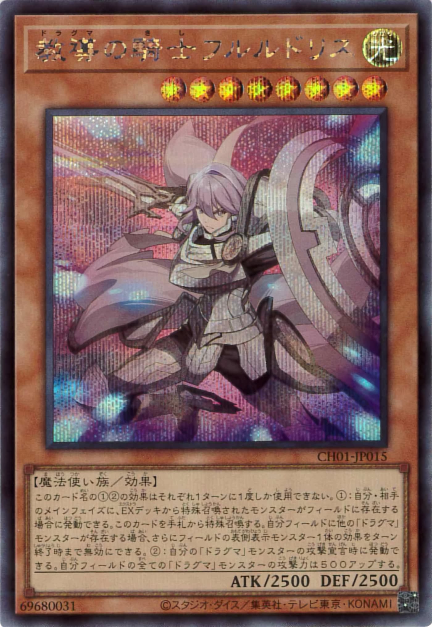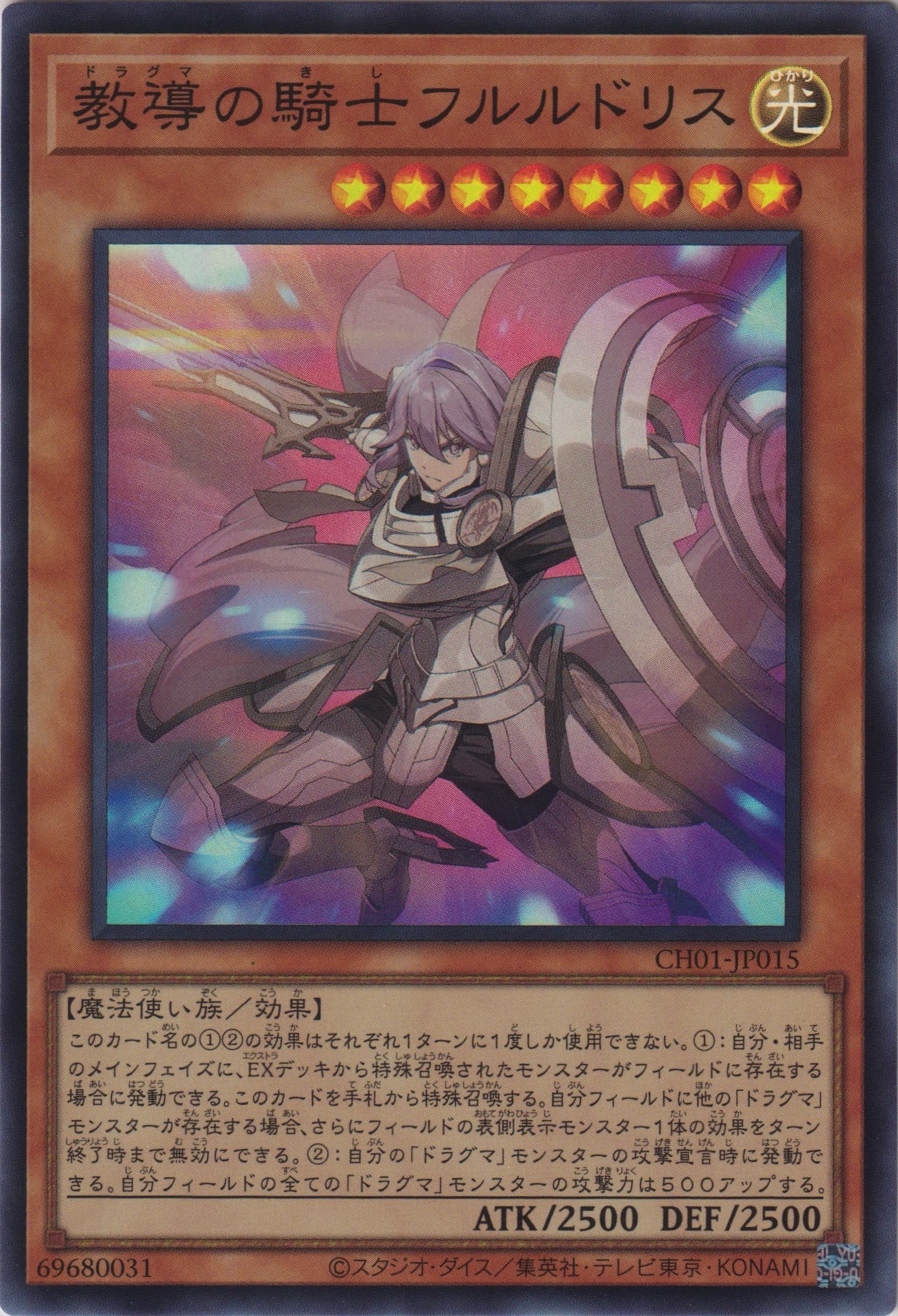 このカード名の①②の効果はそれぞれ1ターンに1度しか使用できない。 ①:自分・相手のメインフェイズに、EXデッキから特殊召喚されたモンスターがフィールドに存在する場合に発動できる。このカードを手札から特殊召喚する。自分フィールドに他の「ドラグマ」モンスターが存在する場合、さらにフィールドの表側表示モンスター1体の効果をターン終了時まで無効にできる。 ②:自分の「ドラグマ」モンスターの攻撃宣言時に発動できる。自分フィールドの全ての「ドラグマ」モンスターの攻撃力は500アップする。