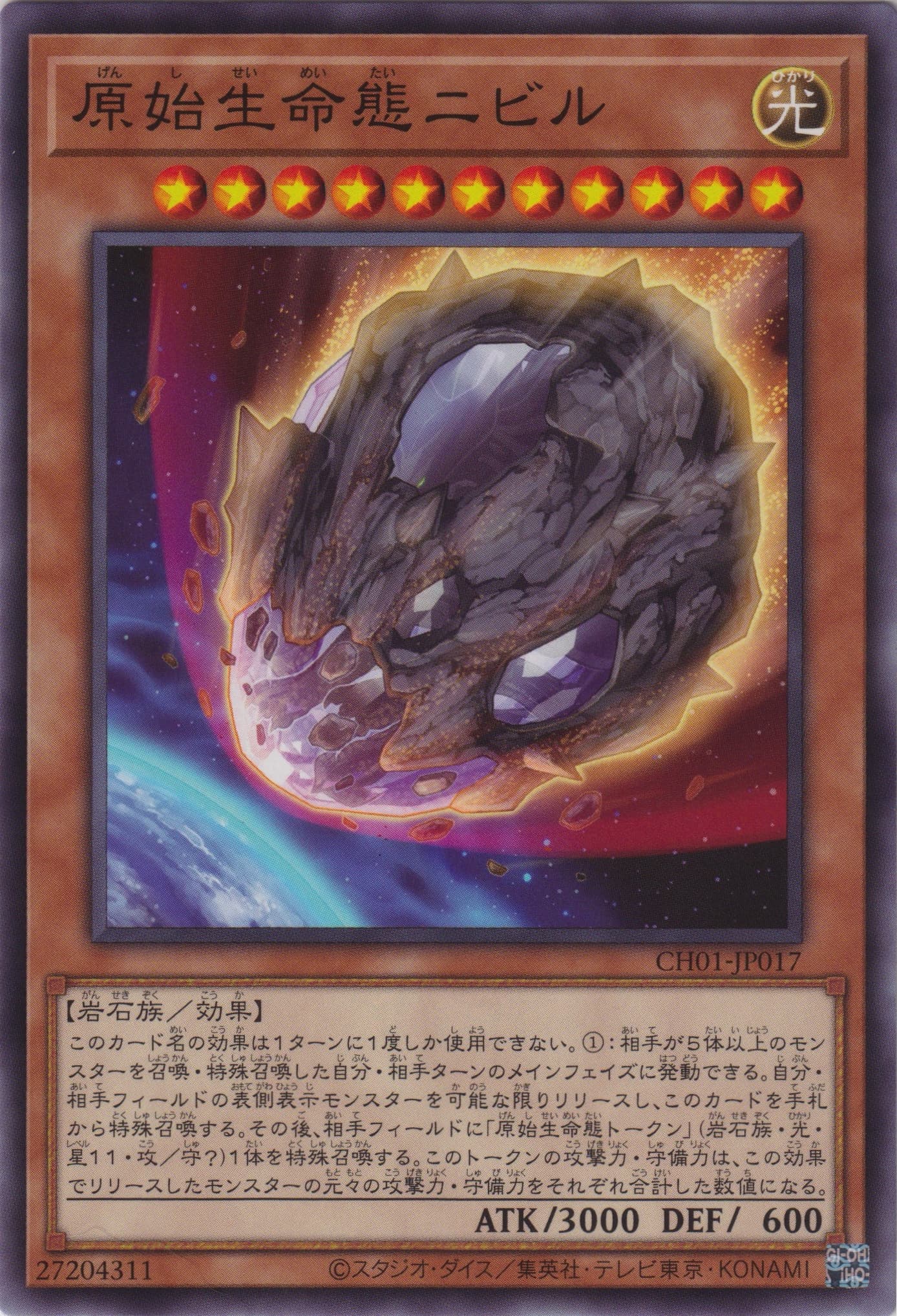 このカード名の効果は1ターンに1度しか使用できない。 ①:相手が5体以上のモンスターを召喚・特殊召喚した自分・相手ターンのメインフェイズに発動できる。自分・相手フィールドの表側表示モンスターを可能な限りリリースし、このカードを手札から特殊召喚する。その後、相手フィールドに「原始生命態トークン」(岩石族・光・星11・攻/守?)1体を特殊召喚する。このトークンの攻撃力・守備力は、この効果でリリースしたモンスターの元々の攻撃力・守備力をそれぞれ合計した数値になる。