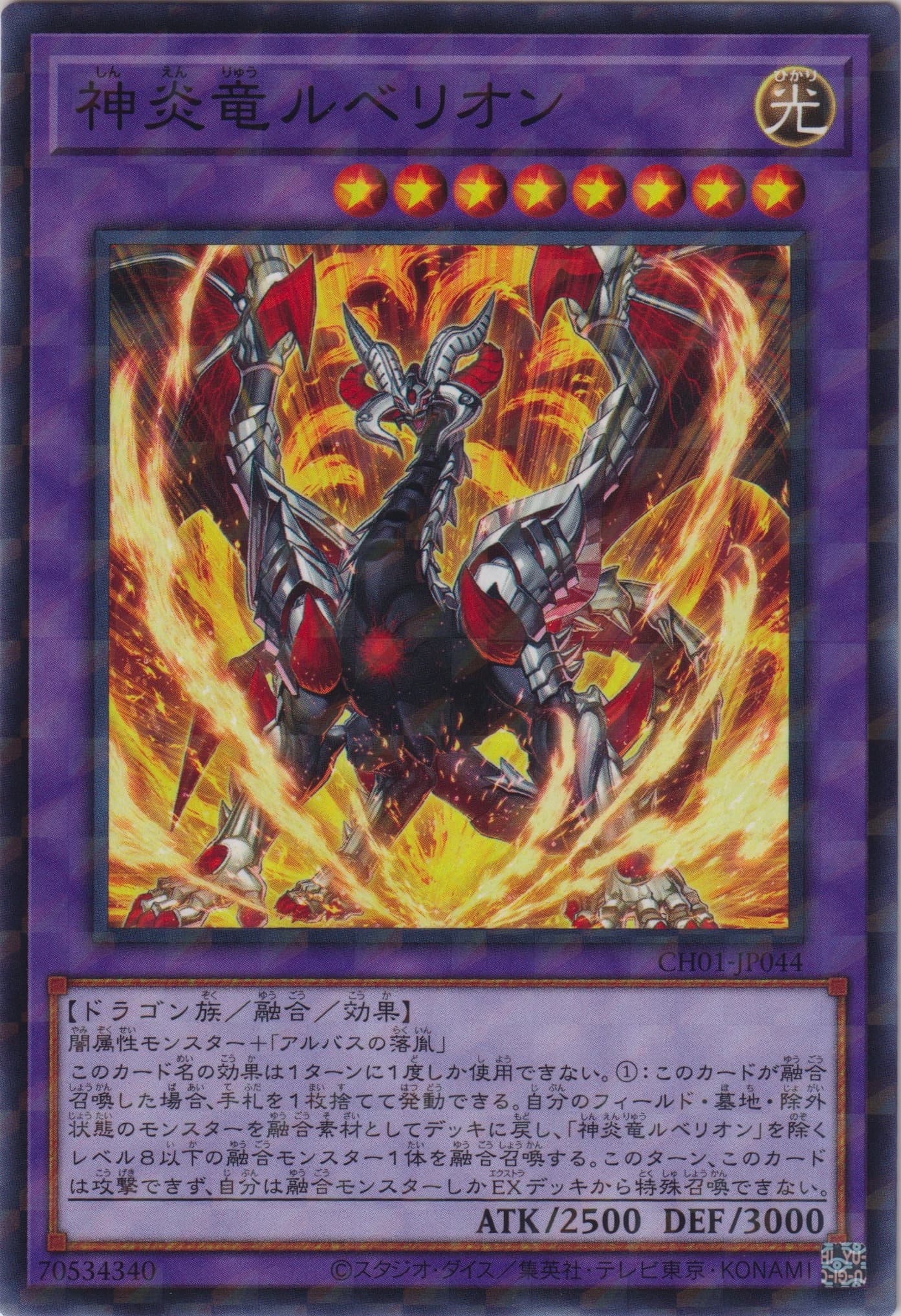 闇属性モンスター+「アルバスの落胤」 このカード名の効果は1ターンに1度しか使用できない。 ①:このカードが融合召喚した場合、手札を1枚捨てて発動できる。自分のフィールド・墓地・除外状態のモンスターを融合素材としてデッキに戻し、「神炎竜ルベリオン」を除くレベル8以下の融合モンスター1体を融合召喚する。このターン、このカードは攻撃できず、自分は融合モンスターしかEXデッキから特殊召喚できない。