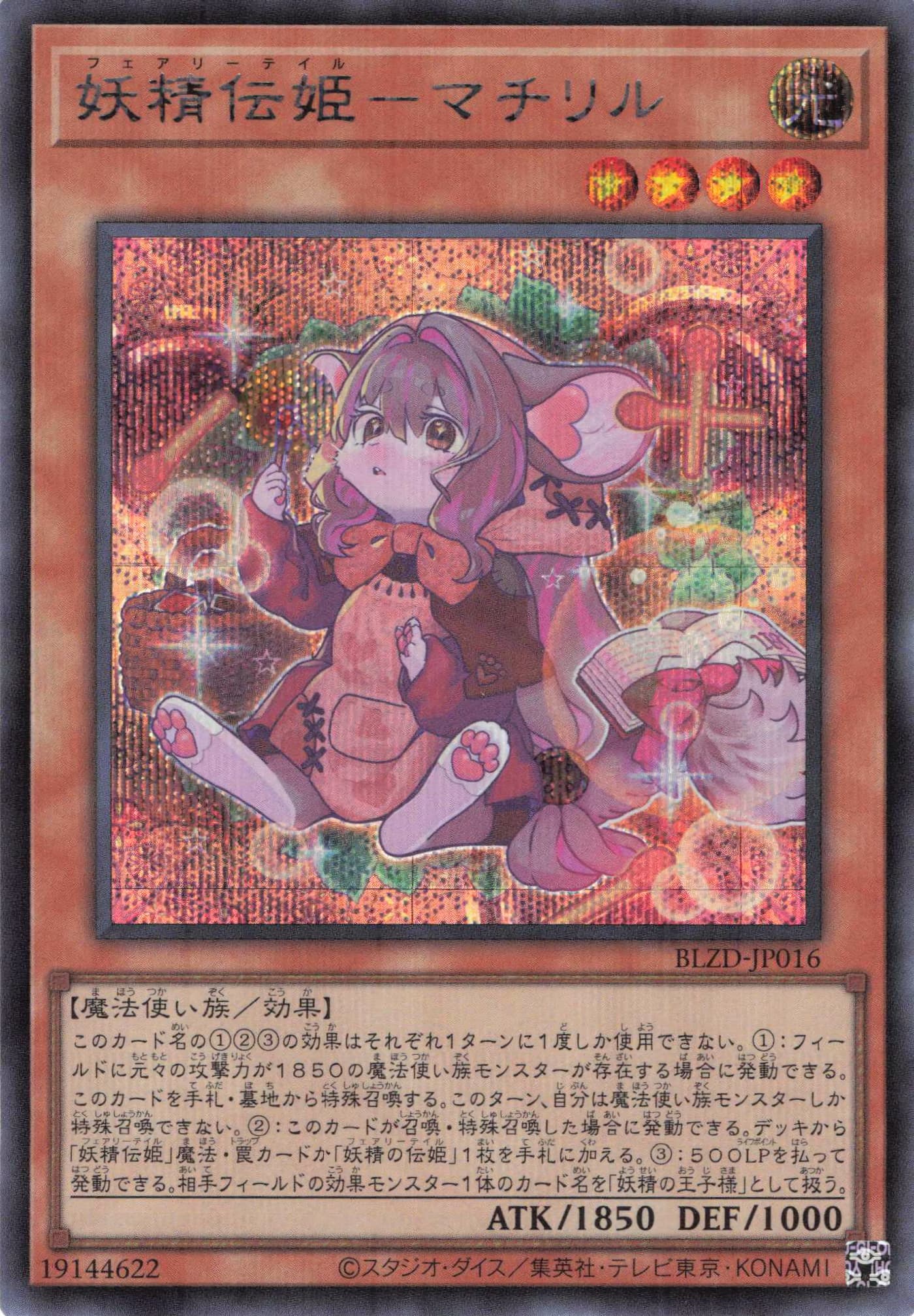 | このカード名の①②③の効果はそれぞれ1ターンに1度しか使用できない。 ①:フィールドに元々の攻撃力が1850の魔法使い族モンスターが存在する場合に発動できる。このカードを手札・墓地から特殊召喚する。このターン、自分は魔法使い族モンスターしか特殊召喚できない。 ②:このカードが召喚・特殊召喚した場合に発動できる。デッキから「妖精伝姫」魔法・罠カードか「妖精の伝姫」1枚を手札に加える。 ③:500LPを払って発動できる。相手フィールドの効果モンスター1体のカード名を「妖精の王子様」として扱う。 | ||||||||