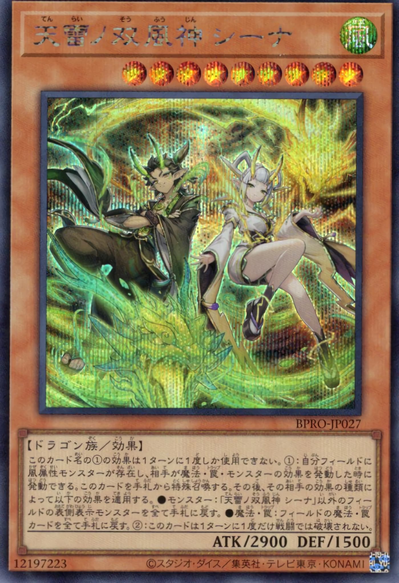 | このカード名の①の効果は1ターンに1度しか使用できない。 ①:自分フィールドに風属性モンスターが存在し、相手が魔法・罠・モンスターの効果を発動した時に発動できる。このカードを手札から特殊召喚する。その後、その相手の効果の種類によって以下の効果を適用する。 ●モンスター:「天雷ノ双風神 シーナ」以外のフィールドの表側表示モンスターを全て手札に戻す。 ●魔法・罠:フィールドの魔法・罠カードを全て手札に戻す。 ②:このカードは1ターンに1度だけ戦闘では破壊されない。 | ||||||||