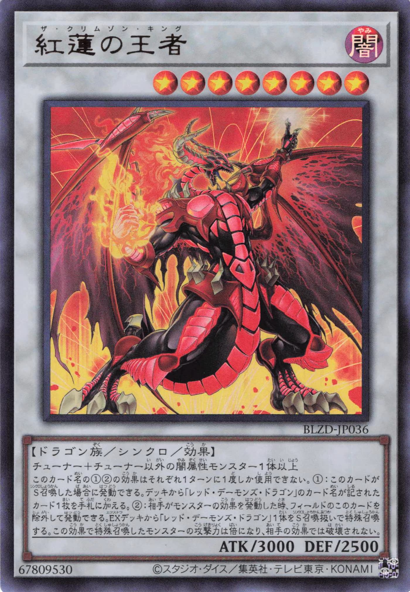 | チューナー+チューナー以外の闇属性モンスター1体以上 このカード名の①②の効果はそれぞれ1ターンに1度しか使用できない。 ①:このカードがS召喚した場合に発動できる。デッキから「レッド・デーモンズ・ドラゴン」のカード名が記されたカード1枚を手札に加える。 ②:相手がモンスターの効果を発動した時、フィールドのこのカードを除外して発動できる。EXデッキから「レッド・デーモンズ・ドラゴン」1体をS召喚扱いで特殊召喚する。この効果で特殊召喚したモンスターの攻撃力は倍になり、相手の効果では破壊されない。 | ||||||||