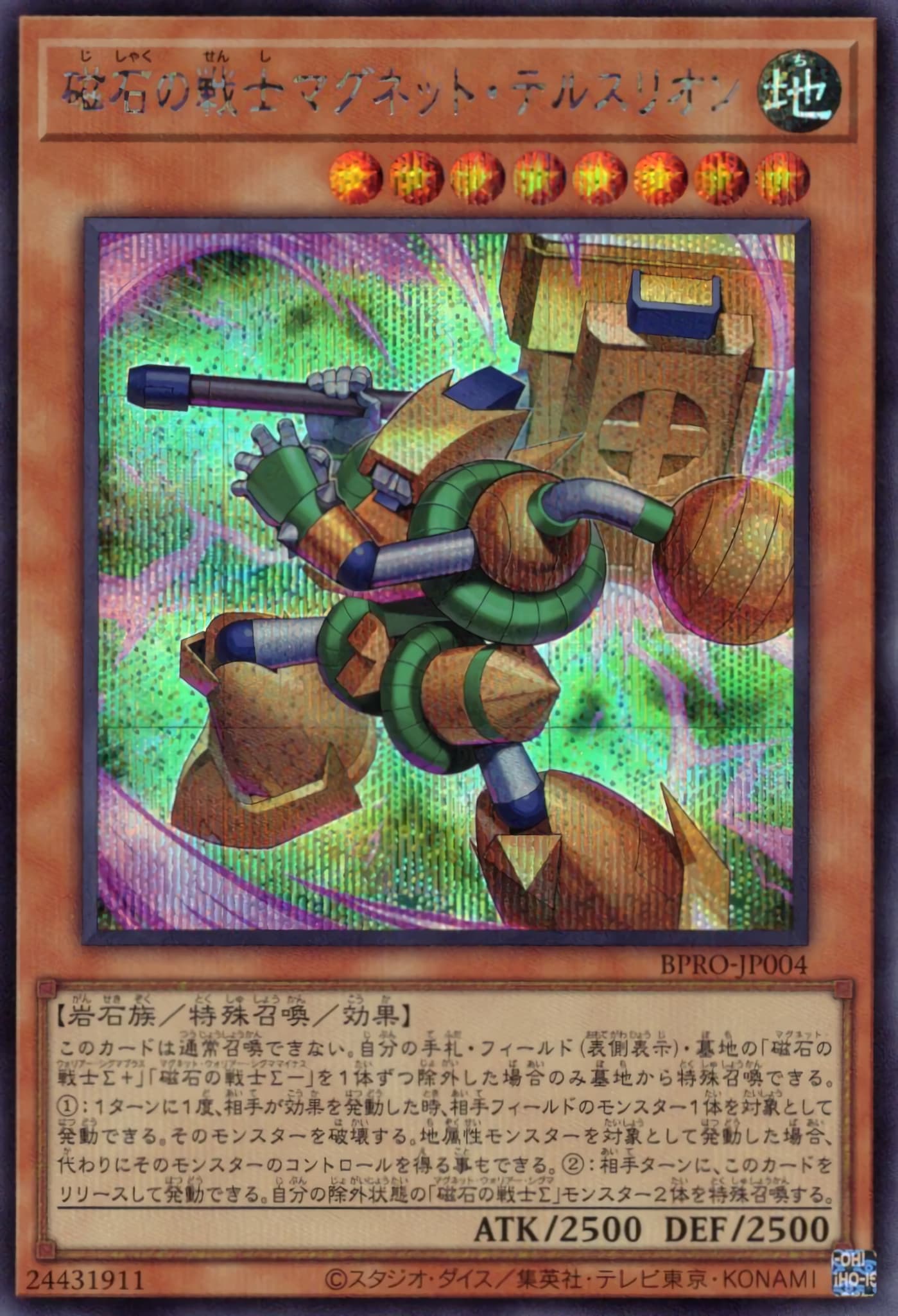 岩石族・地属性モンスター×2 このカード名の①③の効果はそれぞれ1ターンに1度しか使用できない。 ①:このカードが融合召喚した場合に発動できる。デッキから「マグネット」通常・速攻・フィールド魔法カード1枚を手札に加える。 ②:このカードがモンスターゾーンに存在する限り、フィールドの表側表示モンスターは地属性になる。 ③:デッキからレベル8の「磁石の戦士」モンスター1体を墓地へ送って発動できる。レベル4以下の「マグネット・ウォリアー」モンスター1体の召喚を行う。