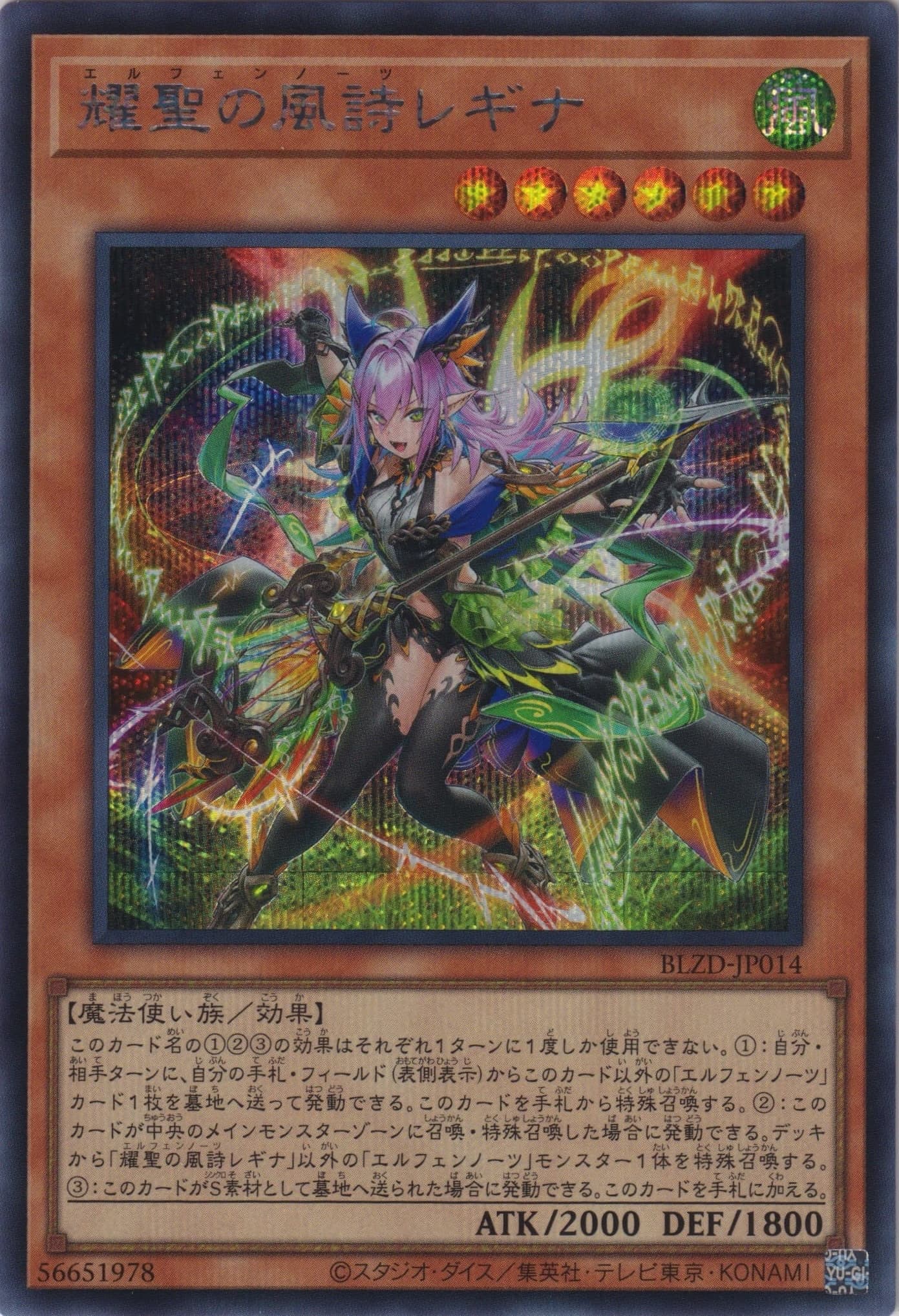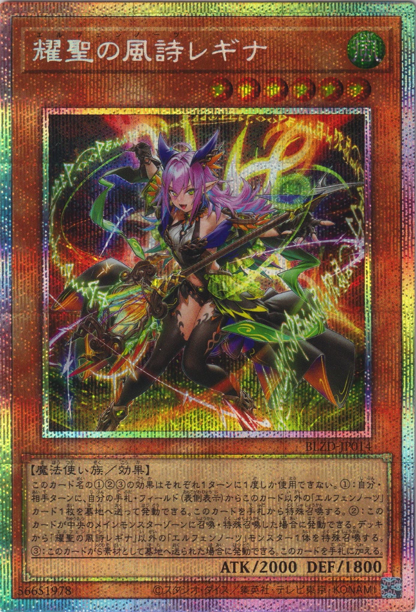 | このカード名の①②③の効果はそれぞれ1ターンに1度しか使用できない。 ①:自分・相手ターンに、自分の手札・フィールド(表側表示)からこのカード以外の「エルフェンノーツ」カード1枚を墓地へ送って発動できる。このカードを手札から特殊召喚する。 ②:このカードが中央のメインモンスターゾーンに召喚・特殊召喚した場合に発動できる。デッキから「耀聖の風詩レギナ」以外の「エルフェンノーツ」モンスター1体を特殊召喚する。 ③:このカードがS素材として墓地へ送られた場合に発動できる。このカードを手札に加える。 | ||||||||