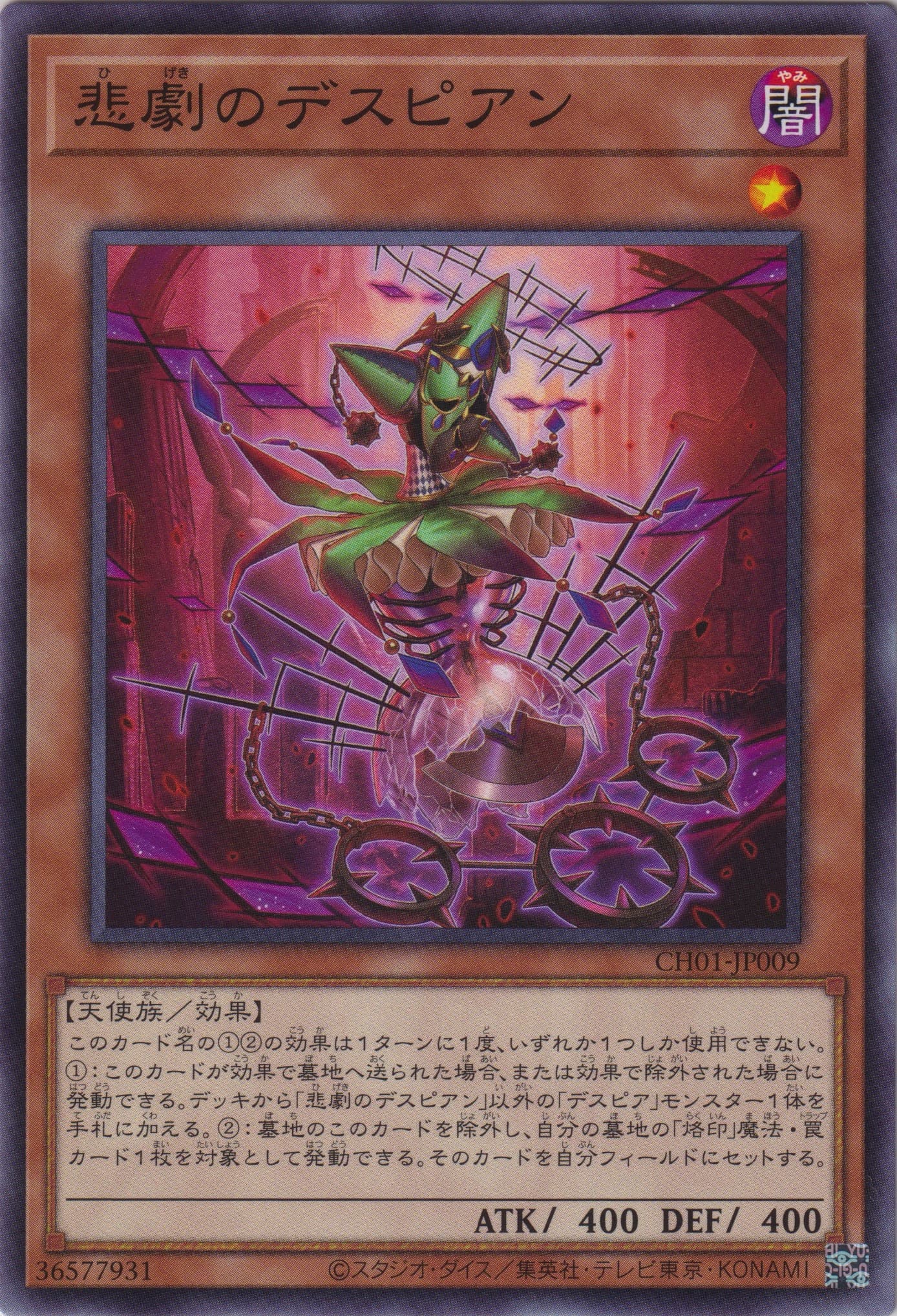 | このカード名の①②の効果は1ターンに1度、いずれか1つしか使用できない。 ①:このカードが効果で墓地へ送られた場合、または効果で除外された場合に発動できる。デッキから「悲劇のデスピアン」以外の「デスピア」モンスター1体を手札に加える。 ②:墓地のこのカードを除外し、自分の墓地の「烙印」魔法・罠カード1枚を対象として発動できる。そのカードを自分フィールドにセットする。 | ||||||||