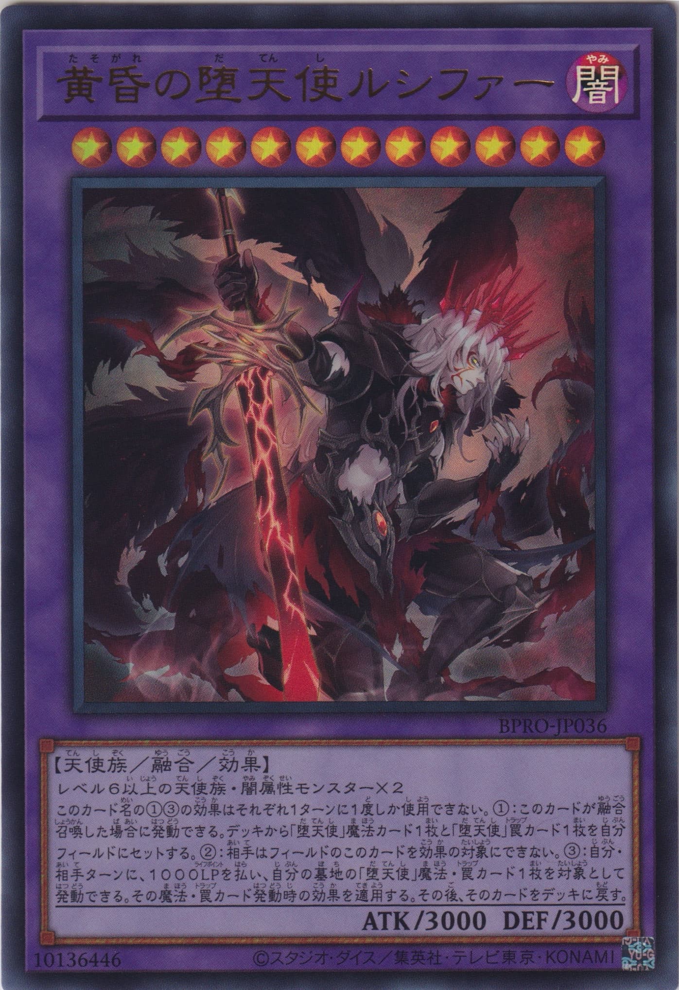 | BPRO-JP036 | たそがれのだてんしルシファー黄昏の堕天使ルシファー | 融合/効果 | photoウルトラ photoプリズマティックシークレット | 収録/公式/Wiki | ||||