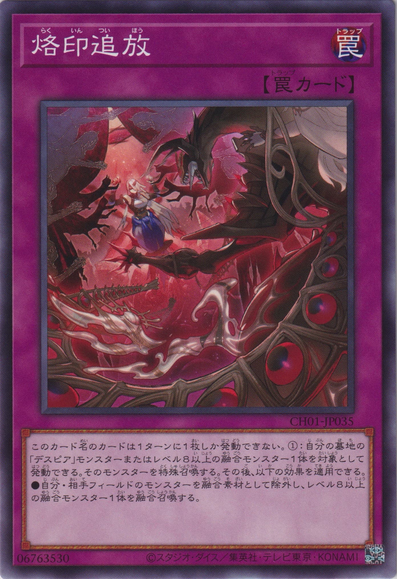 このカード名のカードは1ターンに1枚しか発動できない。 ①:以下の効果から1つを選択して発動できる。 ●相手バトルフェイズに発動できる。相手は1000LP回復する。その後、バトルフェイズを終了する。 ●相手フィールドのカードの数が自分フィールドのカードより多く、相手がモンスターの効果を発動した時に発動できる。自分のEXデッキ・墓地から「レッド・デーモンズ・ドラゴン」か「琰魔竜 レッド・デーモン」1体を特殊召喚し、その発動した効果を無効にし破壊する。