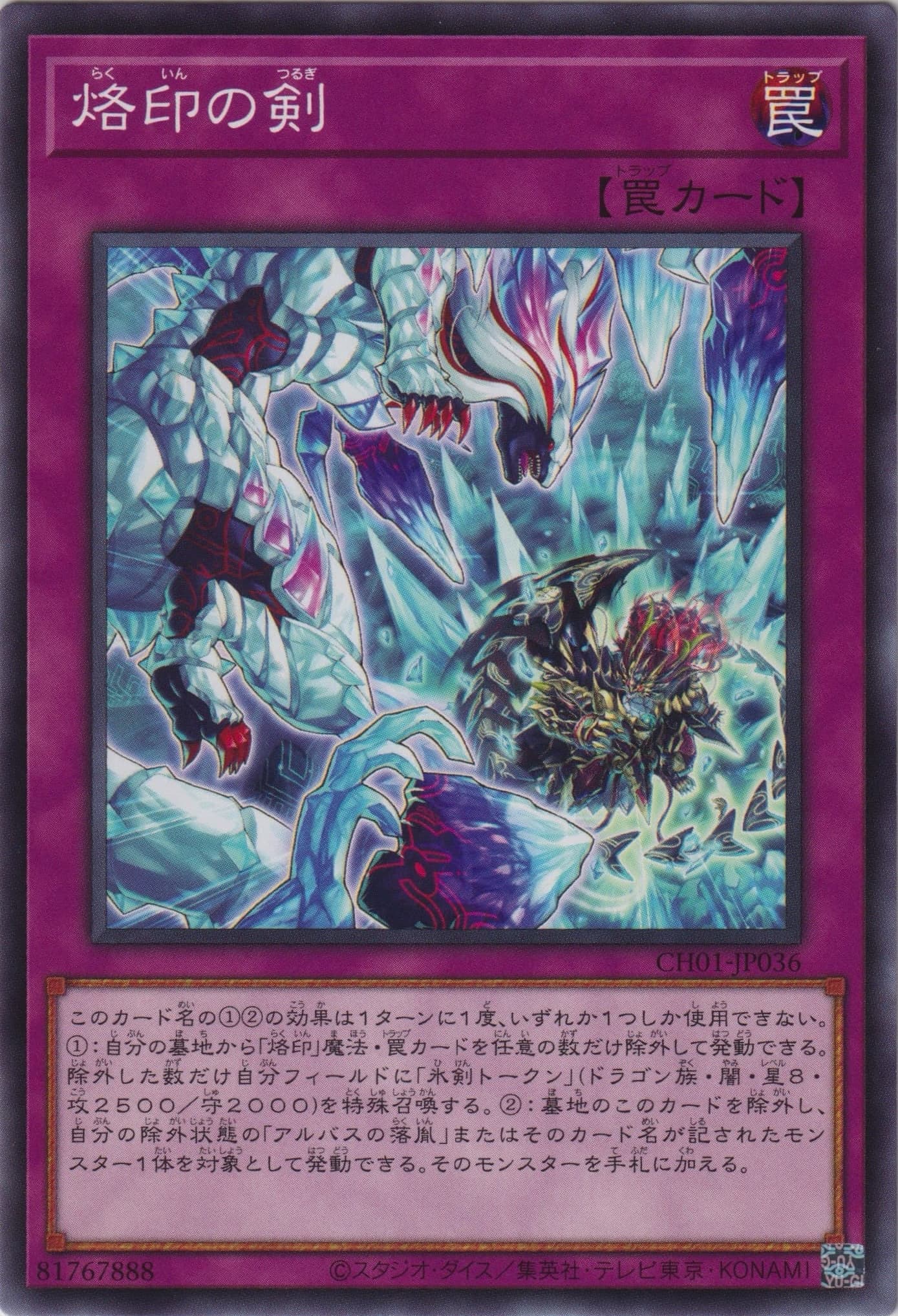 このカード名の①②の効果は1ターンに1度、いずれか1つしか使用できない。 ①:自分の墓地から「烙印」魔法・罠カードを任意の数だけ除外して発動できる。除外した数だけ自分フィールドに「氷剣トークン」(ドラゴン族・闇・星8・攻2500/守2000)を特殊召喚する。 ②:墓地のこのカードを除外し、自分の除外状態の「アルバスの落胤」またはそのカード名が記されたモンスター1体を対象として発動できる。そのモンスターを手札に加える。