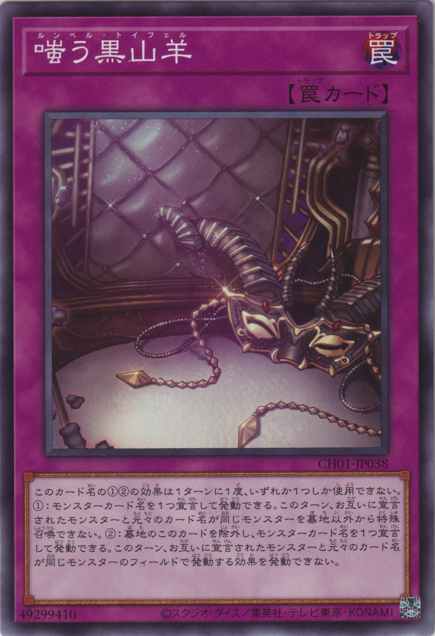 このカード名の①②の効果は1ターンに1度、いずれか1つしか使用できない。 ①:モンスターカード名を1つ宣言して発動できる。このターン、お互いに宣言されたモンスターと元々のカード名が同じモンスターを墓地以外から特殊召喚できない。 ②:墓地のこのカードを除外し、モンスターカード名を1つ宣言して発動できる。このターン、お互いに宣言されたモンスターと元々のカード名が同じモンスターのフィールドで発動する効果を発動できない。