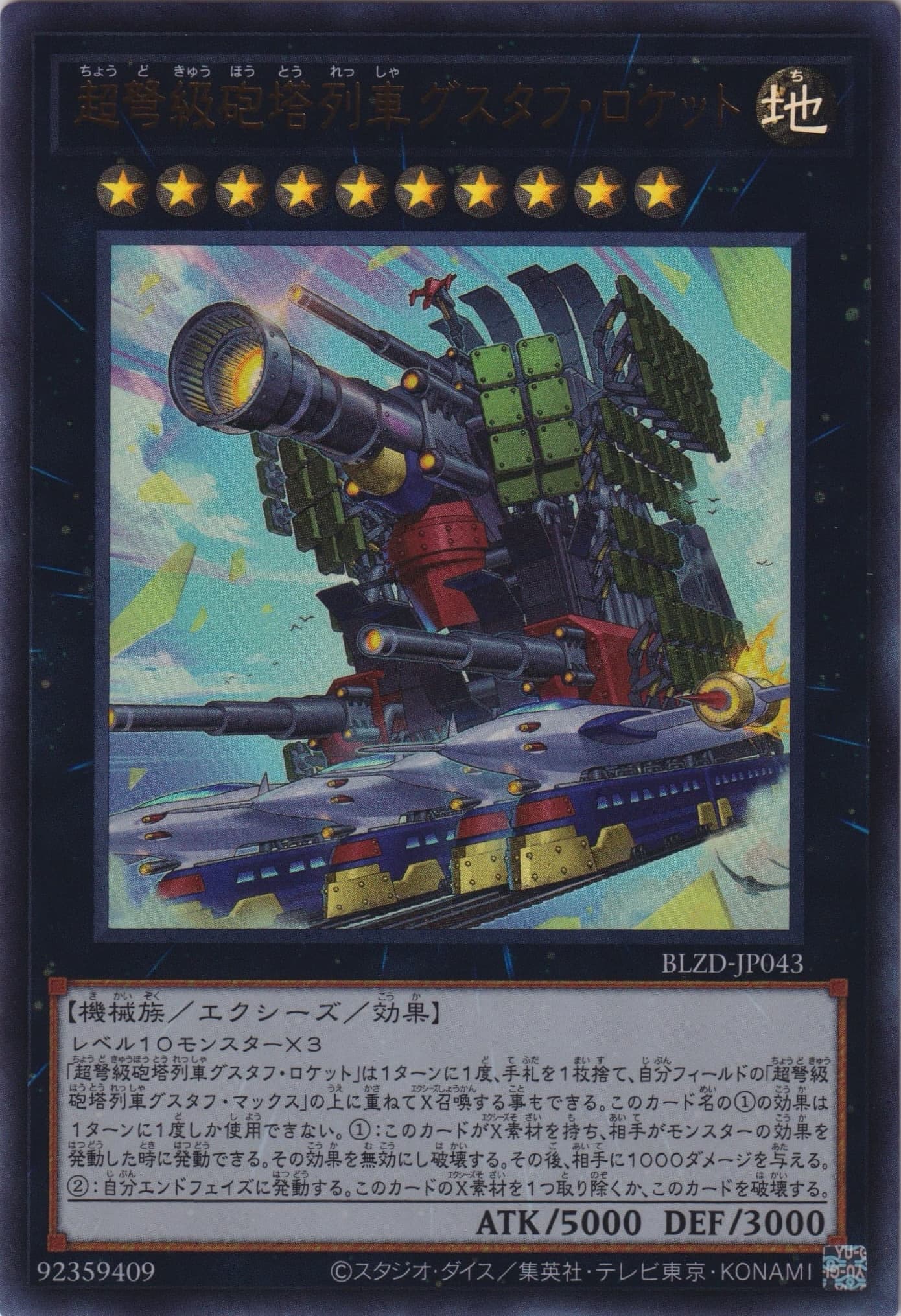 レベル10モンスター×3 「超弩級砲塔列車グスタフ・ロケット」は1ターンに1度、手札を1枚捨て、自分フィールドの「超弩級砲塔列車グスタフ・マックス」の上に重ねてX召喚する事もできる。 このカード名の①の効果は1ターンに1度しか使用できない。 ①:このカードがX素材を持ち、相手がモンスターの効果を発動した時に発動できる。その効果を無効にし破壊する。その後、相手に1000ダメージを与える。 ②:自分エンドフェイズに発動する。このカードのX素材を1つ取り除くか、このカードを破壊する。