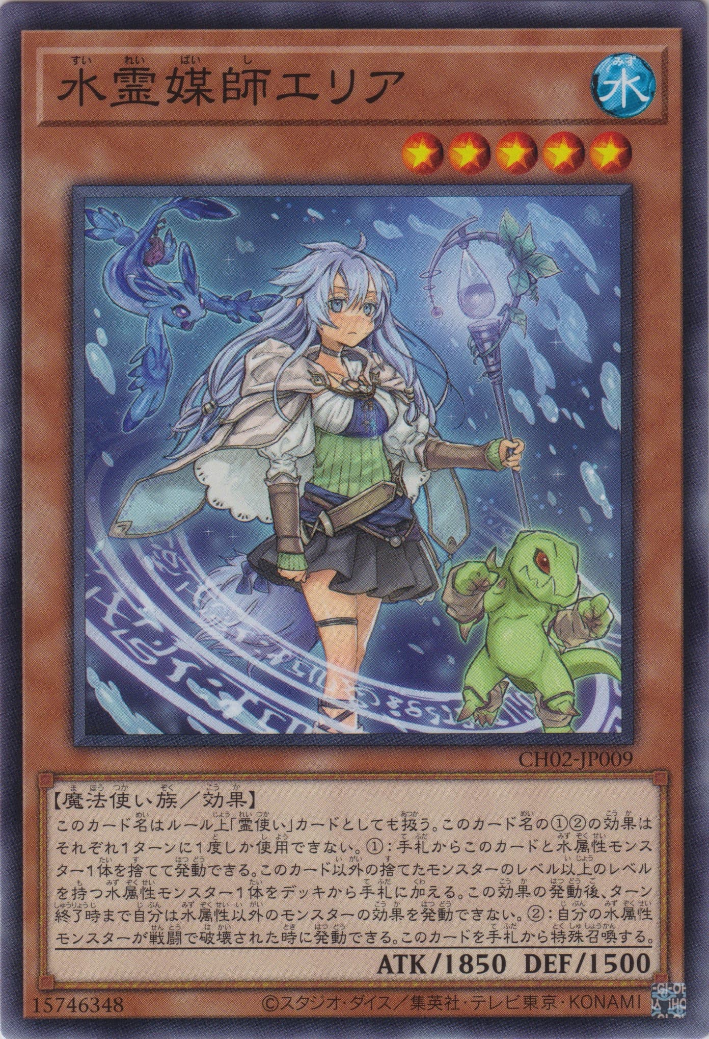 このカード名はルール上「霊使い」カードとしても扱う。 このカード名の①②の効果はそれぞれ1ターンに1度しか使用できない。 ①:手札からこのカードと水属性モンスター1体を捨てて発動できる。このカード以外の捨てたモンスターのレベル以上のレベルを持つ水属性モンスター1体をデッキから手札に加える。この効果の発動後、ターン終了時まで自分は水属性以外のモンスターの効果を発動できない。 ②:自分の水属性モンスターが戦闘で破壊された時に発動できる。このカードを手札から特殊召喚する。