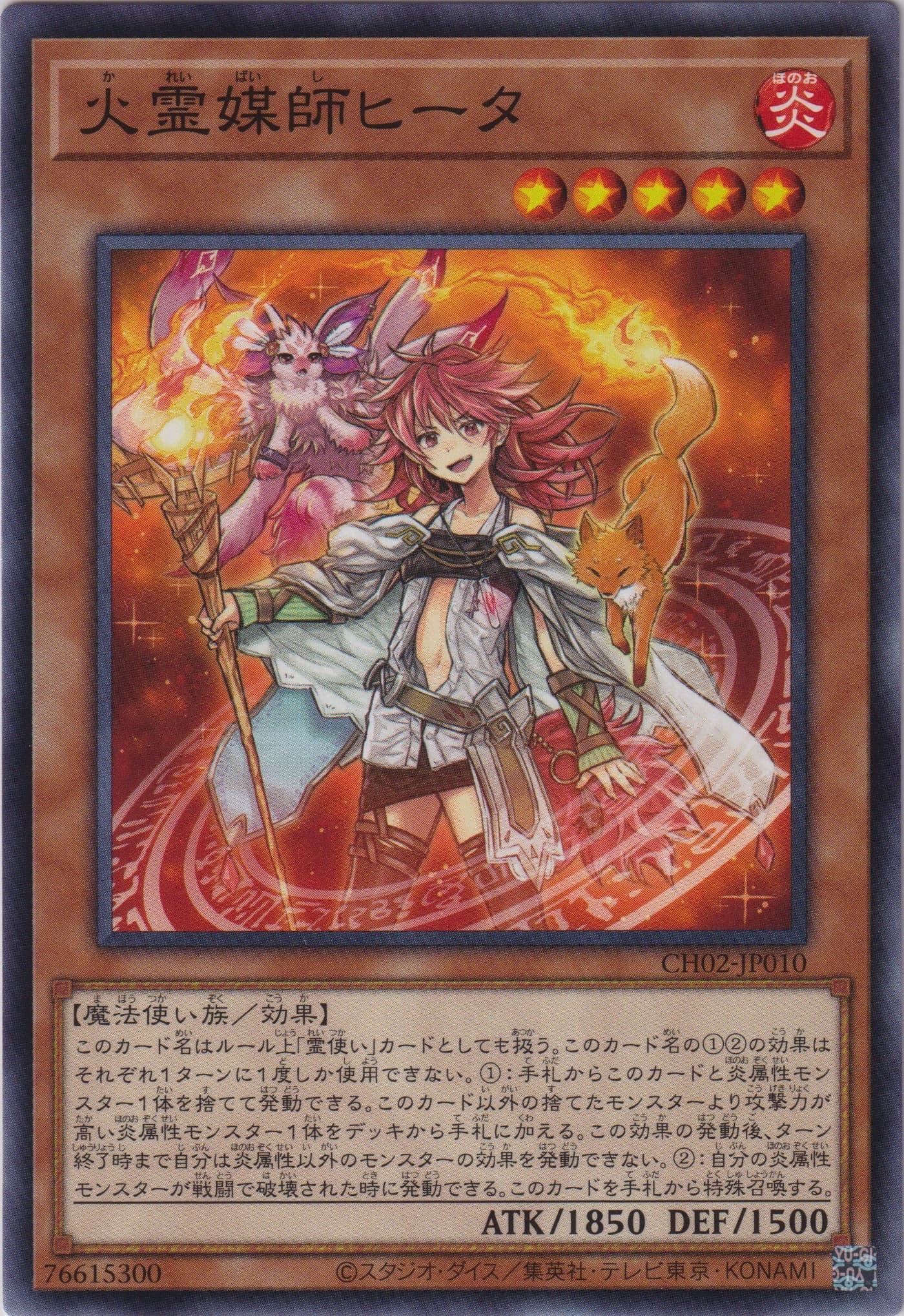 このカード名はルール上「霊使い」カードとしても扱う。 このカード名の①②の効果はそれぞれ1ターンに1度しか使用できない。 ①:手札からこのカードと炎属性モンスター1体を捨てて発動できる。このカード以外の捨てたモンスターより攻撃力が高い炎属性モンスター1体をデッキから手札に加える。この効果の発動後、ターン終了時まで自分は炎属性以外のモンスターの効果を発動できない。 ②:自分の炎属性モンスターが戦闘で破壊された時に発動できる。このカードを手札から特殊召喚する。
