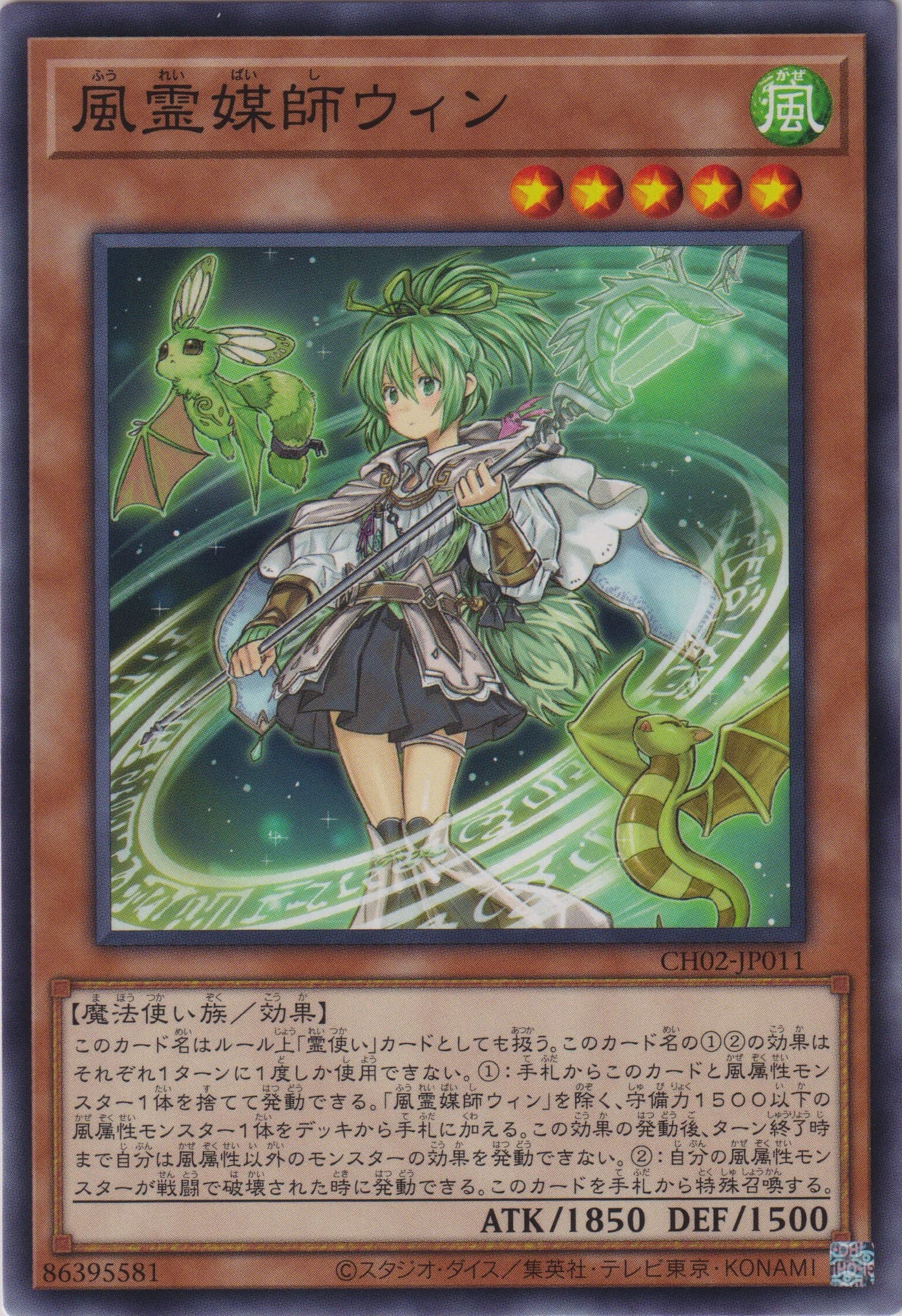 このカード名はルール上「霊使い」カードとしても扱う。 このカード名の①②の効果はそれぞれ1ターンに1度しか使用できない。 ①:手札からこのカードと風属性モンスター1体を捨てて発動できる。「風霊媒師ウィン」を除く、守備力1500以下の風属性モンスター1体をデッキから手札に加える。この効果の発動後、ターン終了時まで自分は風属性以外のモンスターの効果を発動できない。 ②:自分の風属性モンスターが戦闘で破壊された時に発動できる。このカードを手札から特殊召喚する。