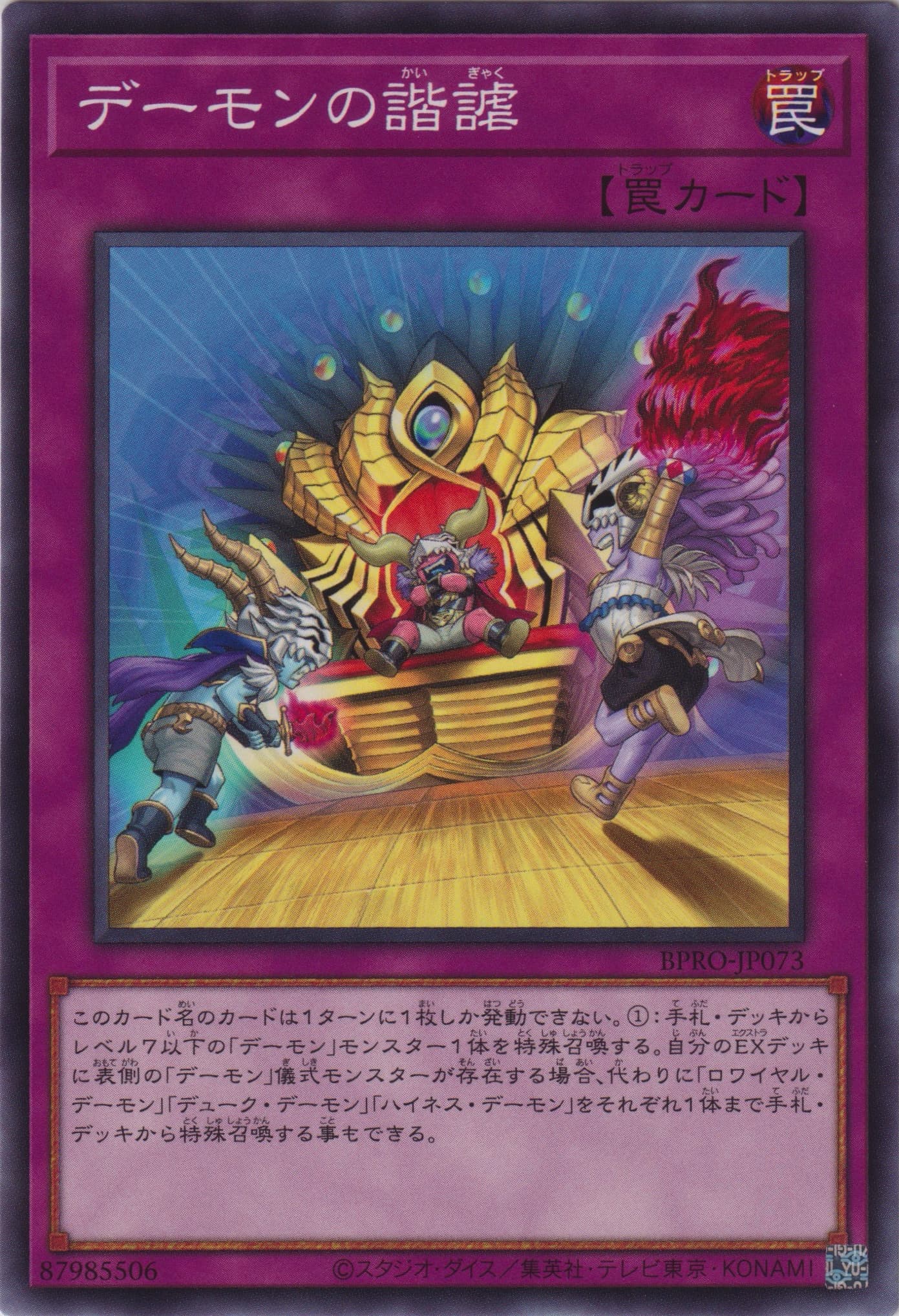 | このカード名のカードは1ターンに1枚しか発動できない。 ①:手札・デッキからレベル7以下の「デーモン」モンスター1体を特殊召喚する。自分のEXデッキに表側の「デーモン」儀式モンスターが存在する場合、代わりに「ロワイヤル・デーモン」「デューク・デーモン」「ハイネス・デーモン」をそれぞれ1体まで手札・デッキから特殊召喚する事もできる。 | ||||||||