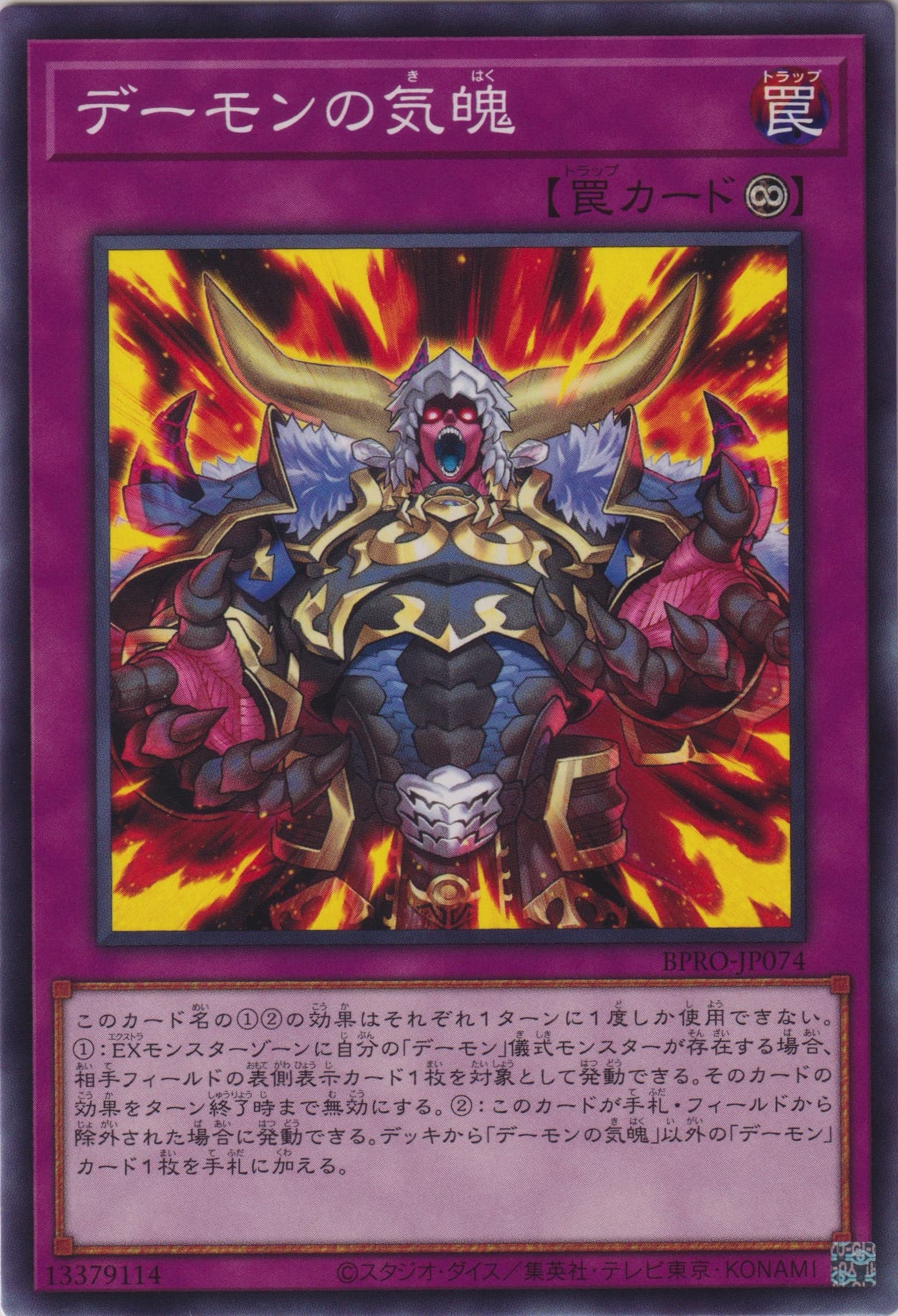 | このカード名の①②の効果はそれぞれ1ターンに1度しか使用できない。 ①:EXモンスターゾーンに自分の「デーモン」儀式モンスターが存在する場合、相手フィールドの表側表示カード1枚を対象として発動できる。そのカードの効果をターン終了時まで無効にする。 ②:このカードが手札・フィールドから除外された場合に発動できる。デッキから「デーモンの気魄」以外の「デーモン」カード1枚を手札に加える。 | ||||||||