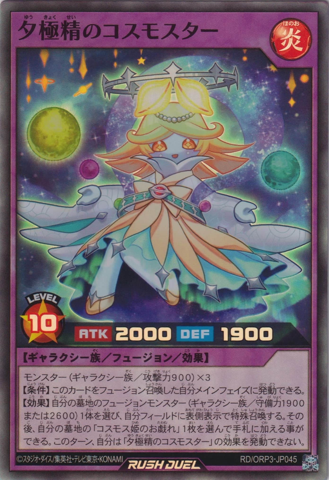 | モンスター(ギャラクシー族/攻撃力900)×3 【条件】このカードをフュージョン召喚した自分メインフェイズに発動できる。 【効果】自分の墓地のフュージョンモンスター(ギャラクシー族/守備力1900または2600)1体を選び、自分フィールドに表側表示で特殊召喚する。その後、自分の墓地の「コスモス姫のお戯れ」1枚を選んで手札に加える事ができる。このターン、自分は「夕極精のコスモスター」の効果を発動できない。 | ||||||||