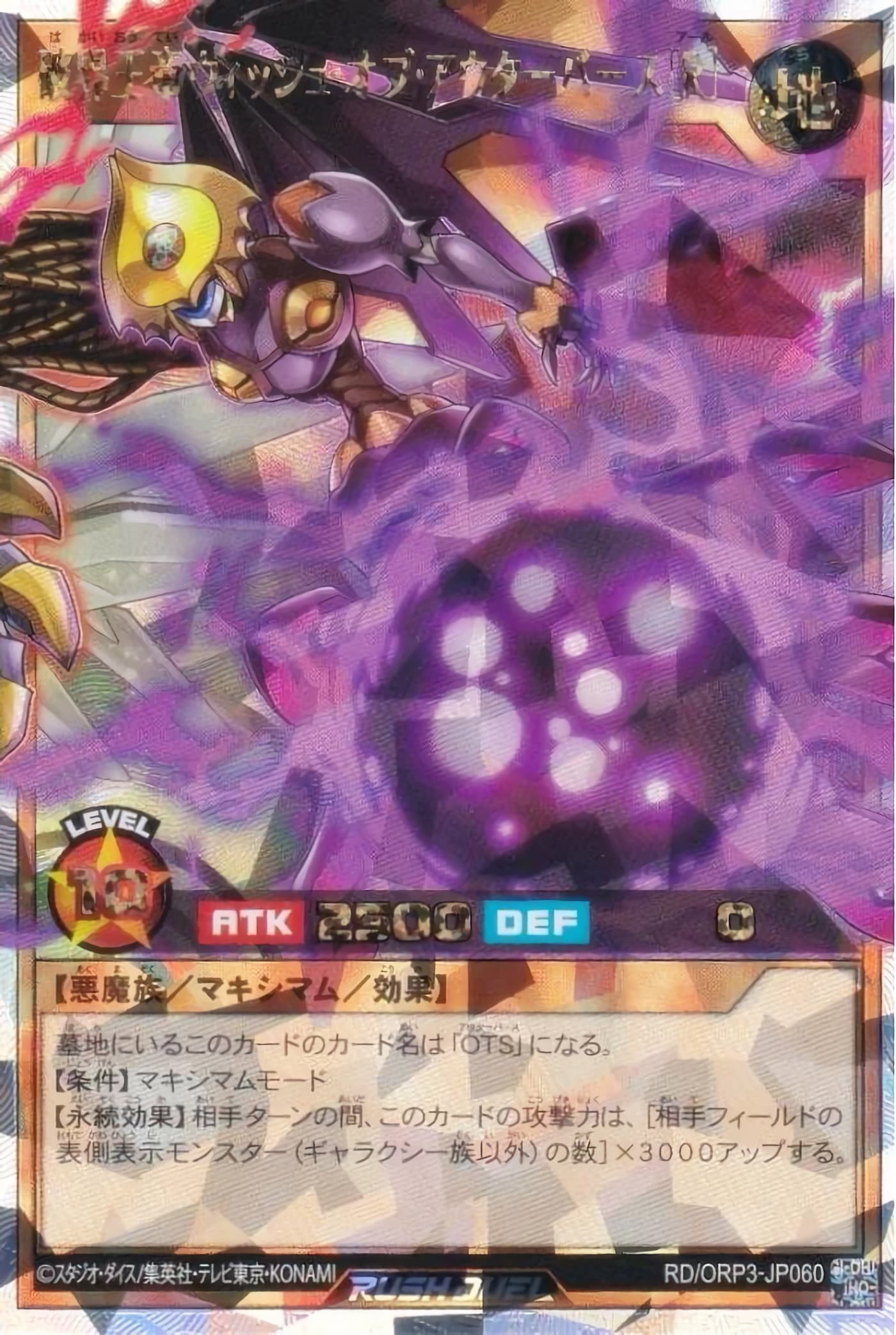 | 「破界王帝ウィッシュ・オブ・アウターバース[L]」「破界王帝ウィッシュ・オブ・アウターバース[R]」と揃えてマキシマム召喚できる。墓地にいるこのカードのカード名は「OTS」になる。 【条件】マキシマムモード 【永続効果】相手フィールドの表側表示モンスター(ギャラクシー族以外)の攻撃力は3000ダウンする。自分ターンの間、このカードの種族はギャラクシー族になり、その攻撃は貫通する。 | ||||||||