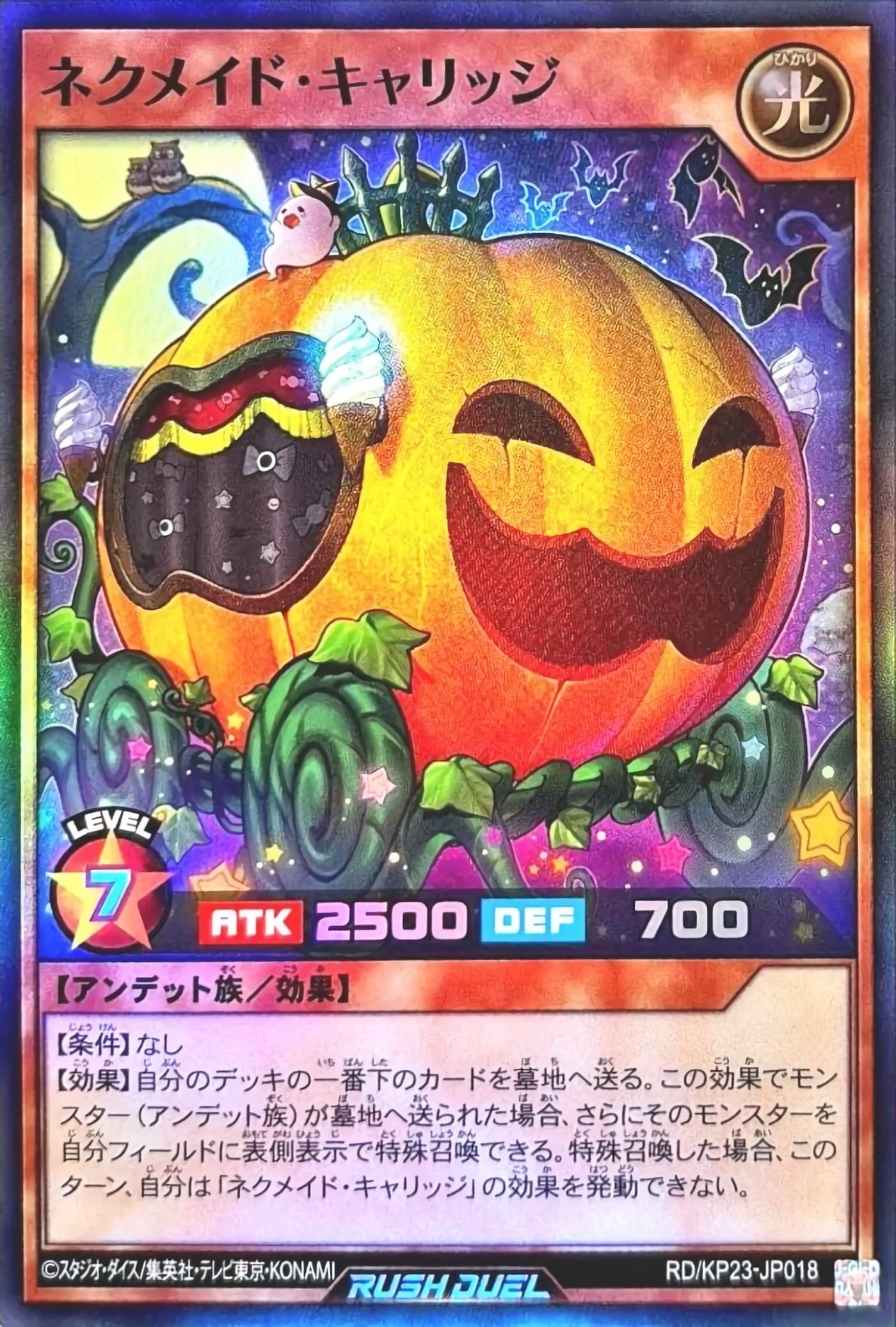 | 【条件】なし 【効果】自分のデッキの一番下のカードを墓地へ送る。この効果でモンスター(アンデット族)が墓地へ送られた場合、さらにそのモンスターを自分フィールドに表側表示で特殊召喚できる。特殊召喚した場合、このターン、自分は「ネクメイド・キャリッジ」の効果を発動できない。 | ||||||||