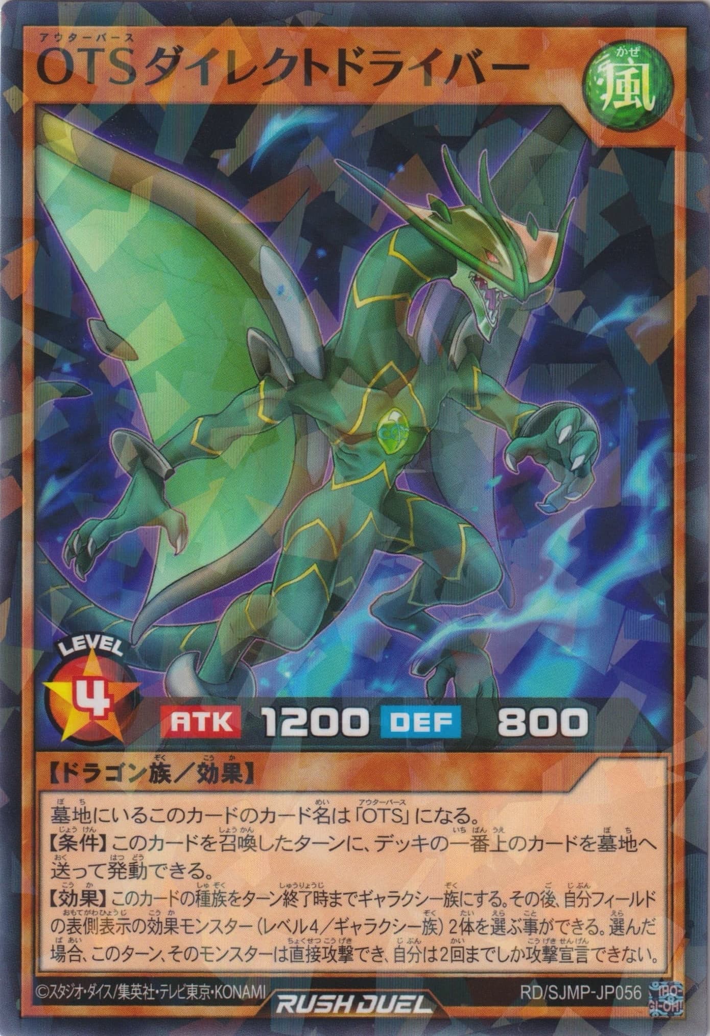 | 墓地にいるこのカードのカード名は「OTS」になる。 【条件】このカードを召喚したターンに、デッキの一番上のカードを墓地へ送って発動できる。 【効果】このカードの種族をターン終了時までギャラクシー族にする。その後、自分フィールドの表側表示の効果モンスター(レベル4/ギャラクシー族)2体を選ぶ事ができる。選んだ場合、このターン、そのモンスターは直接攻撃でき、自分は2回までしか攻撃宣言できない。 | |||||||||